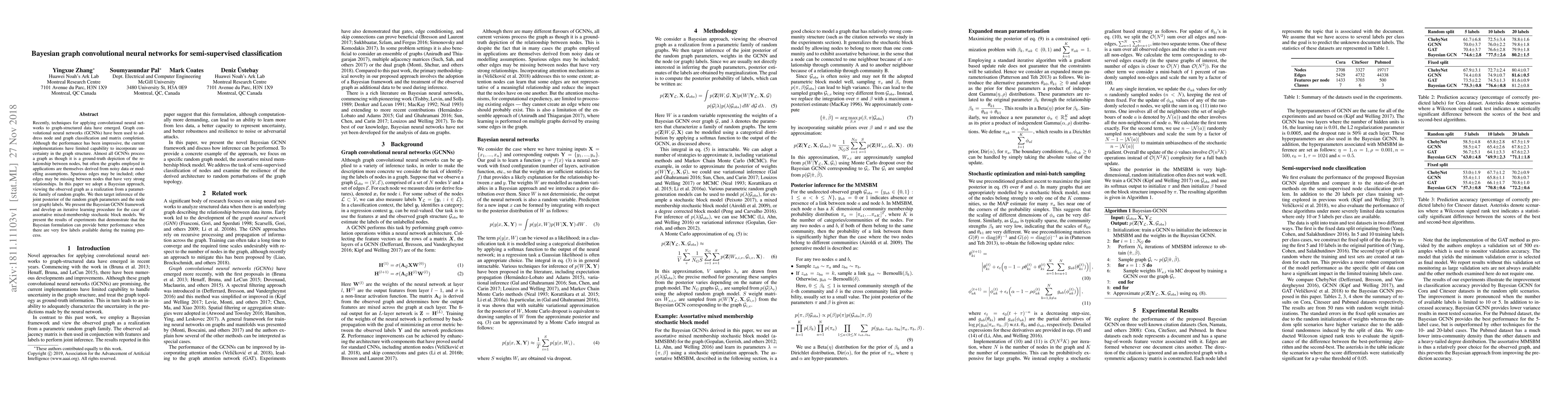 Recently, techniques for applying convolutional neural networks to graph-structured data have emerged. Graph convolutional neural networks (GCNNs) have been used to address node and graph classification and matrix completion. Although the performance has been impressive, the current implementations have limited capability to incorporate uncertainty in the graph structure. Almost all GCNNs process a graph as though it is a ground-truth depiction of the relationship between nodes, but often the graphs employed in applications are themselves derived from noisy data or modelling assumptions. Spurious edges may be included; other edges may be missing between nodes that have very strong relationships. In this paper we adopt a Bayesian approach, viewing the observed graph as a realization from a parametric family of random graphs. We then target inference of the joint posterior of the random graph parameters and the node (or graph) labels. We present the Bayesian GCNN framework and develop an iterative learning procedure for the case of assortative mixed-membership stochastic block models. We present the results of experiments that demonstrate that the Bayesian formulation can provide better performance when there are very few labels available during the training process.