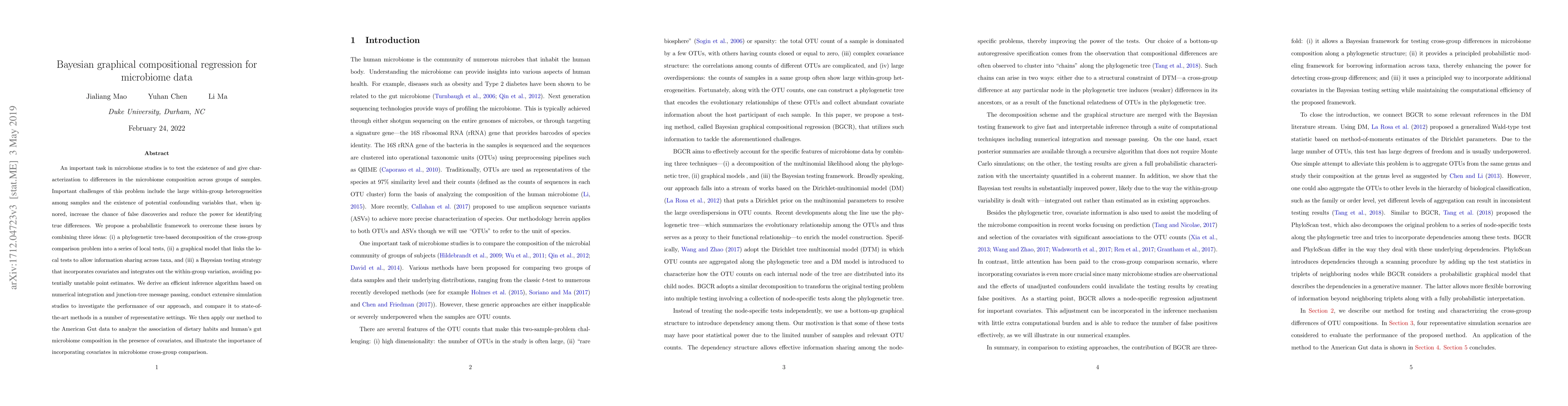 This paper proposes a Bayesian graphical compositional regression framework to analyze microbiome data, addressing challenges like within-group heterogeneity and confounding variables. The method combines phylogenetic tree-based decomposition, graphical modeling, and Bayesian testing to enhance accuracy and avoid false discoveries.