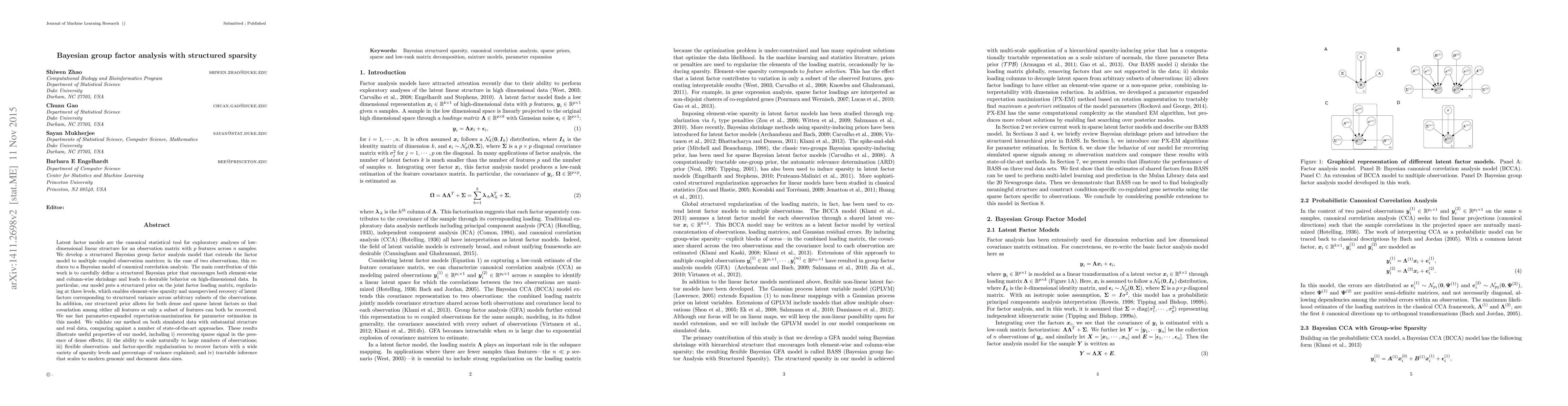 This paper introduces a structured Bayesian group latent factor analysis model that extends canonical correlation analysis to multiple observation matrices, employing a structured prior for element-wise and column-wise shrinkage. The model enables unsupervised recovery of latent factors and scales to large datasets, demonstrating effective sparse signal recovery and flexible observation-specific regularization.