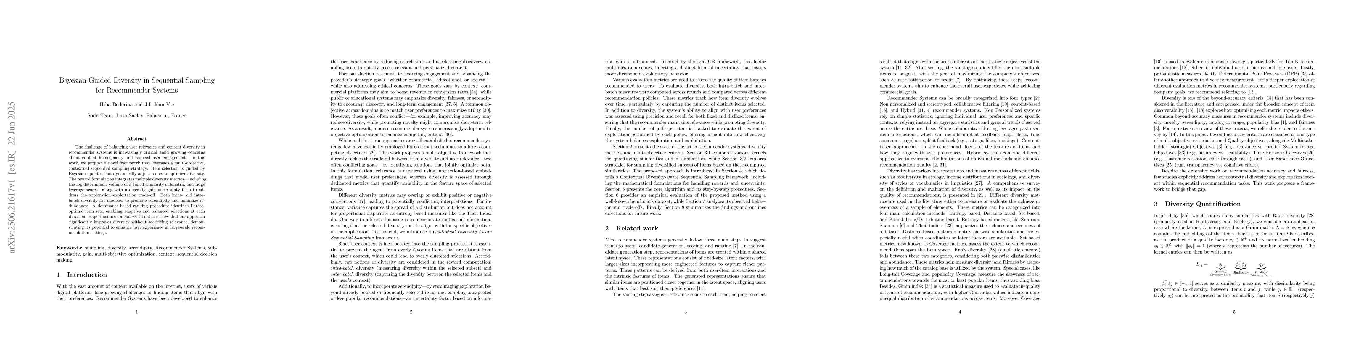 The paper proposes a Bayesian-guided diversity framework for sequential sampling in recommender systems, using multi-objective contextual sampling strategies and Bayesian updates to optimize diversity while maintaining relevance.