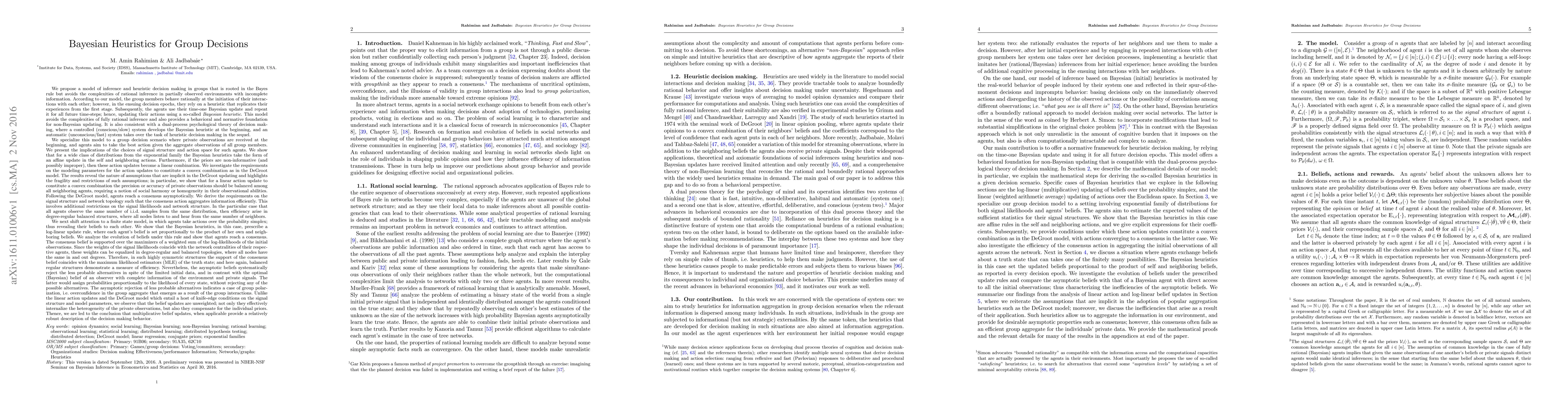 We propose a model of inference and heuristic decision-making in groups that is rooted in the Bayes rule but avoids the complexities of rational inference in partially observed environments with incomplete information, which are characteristic of group interactions. Our model is also consistent with a dual-process psychological theory of thinking: the group members behave rationally at the initiation of their interactions with each other (the slow and deliberative mode); however, in the ensuing decision epochs, they rely on a heuristic that replicates their experiences from the first stage (the fast automatic mode). We specialize this model to a group decision scenario where private observations are received at the beginning, and agents aim to take the best action given the aggregate observations of all group members. We study the implications of the information structure together with the properties of the probability distributions which determine the structure of the so-called "Bayesian heuristics" that the agents follow in our model. We also analyze the group decision outcomes in two classes of linear action updates and log-linear belief updates and show that many inefficiencies arise in group decisions as a result of repeated interactions between individuals, leading to overconfident beliefs as well as choice-shifts toward extremes. Nevertheless, balanced regular structures demonstrate a measure of efficiency in terms of aggregating the initial information of individuals. These results not only verify some well-known insights about group decision-making but also complement these insights by revealing additional mechanistic interpretations for the group declension-process, as well as psychological and cognitive intuitions about the group interaction model.