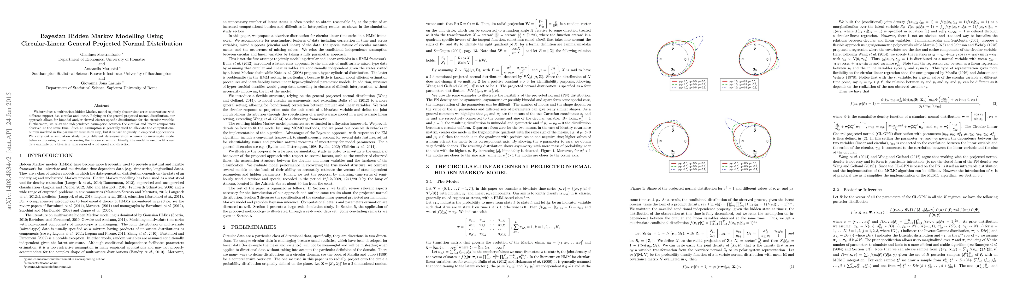 This paper introduces a Bayesian hidden Markov model that jointly clusters time-series observations with different support (circular and linear) using a general projected normal distribution. The approach relaxes the independence assumption between circular and linear components, allowing for more realistic modeling of real-world data.