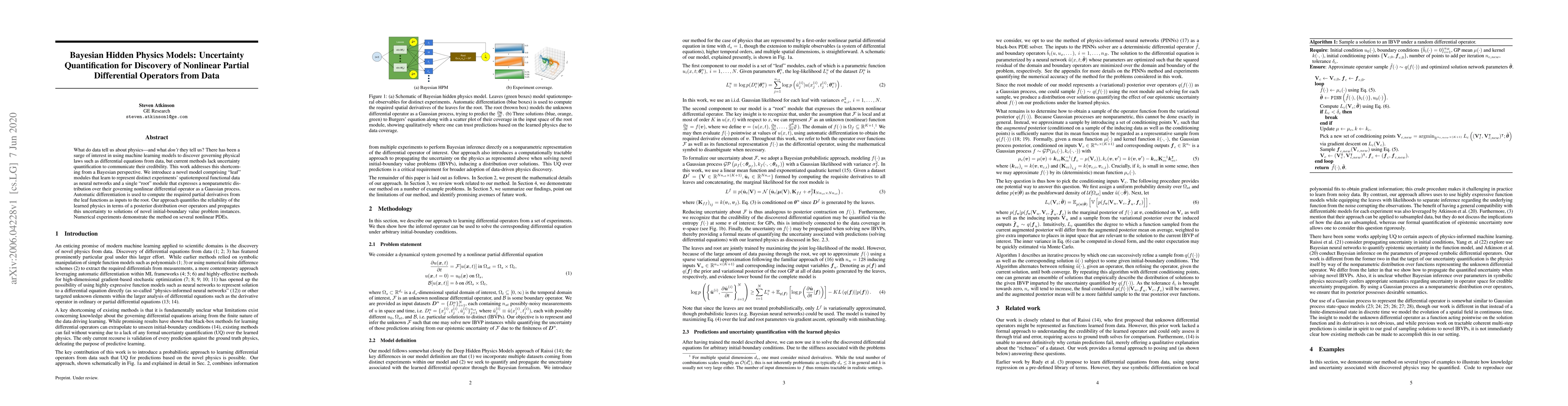 What do data tell us about physics-and what don't they tell us? There has been a surge of interest in using machine learning models to discover governing physical laws such as differential equations from data, but current methods lack uncertainty quantification to communicate their credibility. This work addresses this shortcoming from a Bayesian perspective. We introduce a novel model comprising "leaf" modules that learn to represent distinct experiments' spatiotemporal functional data as neural networks and a single "root" module that expresses a nonparametric distribution over their governing nonlinear differential operator as a Gaussian process. Automatic differentiation is used to compute the required partial derivatives from the leaf functions as inputs to the root. Our approach quantifies the reliability of the learned physics in terms of a posterior distribution over operators and propagates this uncertainty to solutions of novel initial-boundary value problem instances. Numerical experiments demonstrate the method on several nonlinear PDEs.