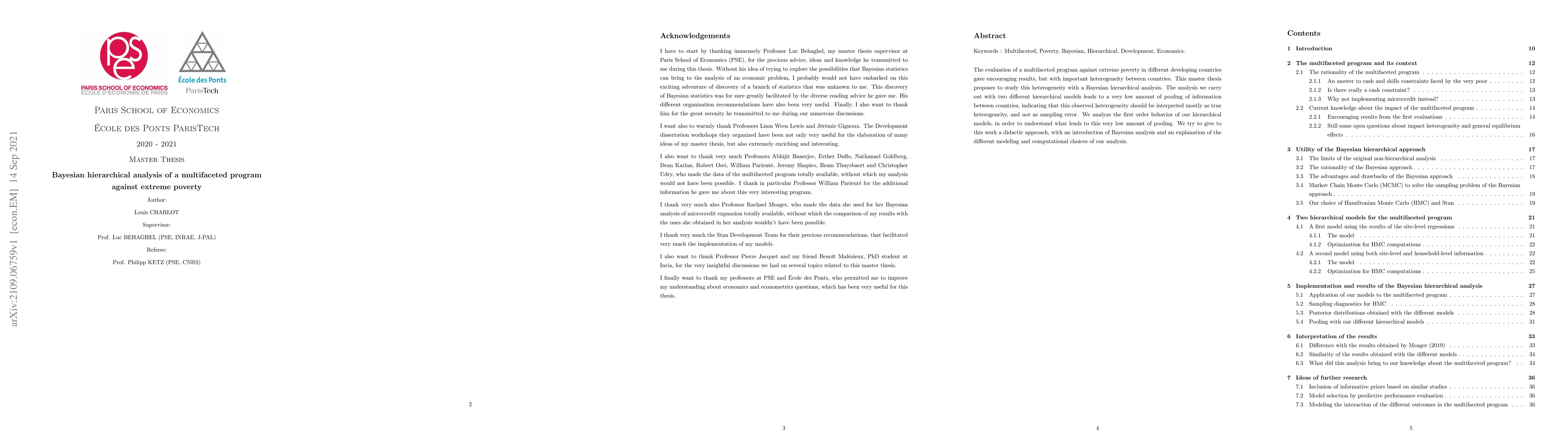 The evaluation of a multifaceted program against extreme poverty in different developing countries gave encouraging results, but with important heterogeneity between countries. This master thesis proposes to study this heterogeneity with a Bayesian hierarchical analysis. The analysis we carry out with two different hierarchical models leads to a very low amount of pooling of information between countries, indicating that this observed heterogeneity should be interpreted mostly as true heterogeneity, and not as sampling error. We analyze the first order behavior of our hierarchical models, in order to understand what leads to this very low amount of pooling. We try to give to this work a didactic approach, with an introduction of Bayesian analysis and an explanation of the different modeling and computational choices of our analysis.
