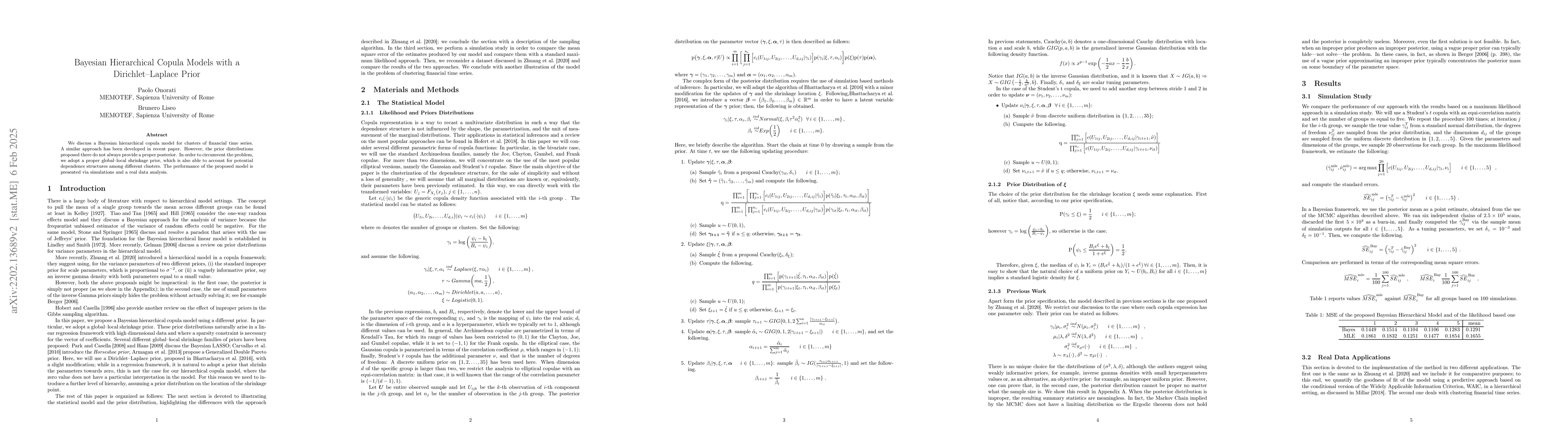 This paper introduces a Bayesian hierarchical copula model for analyzing clusters of financial time series, addressing previous issues with prior distributions and providing improved performance through shrinkage priors that account for dependence structure.