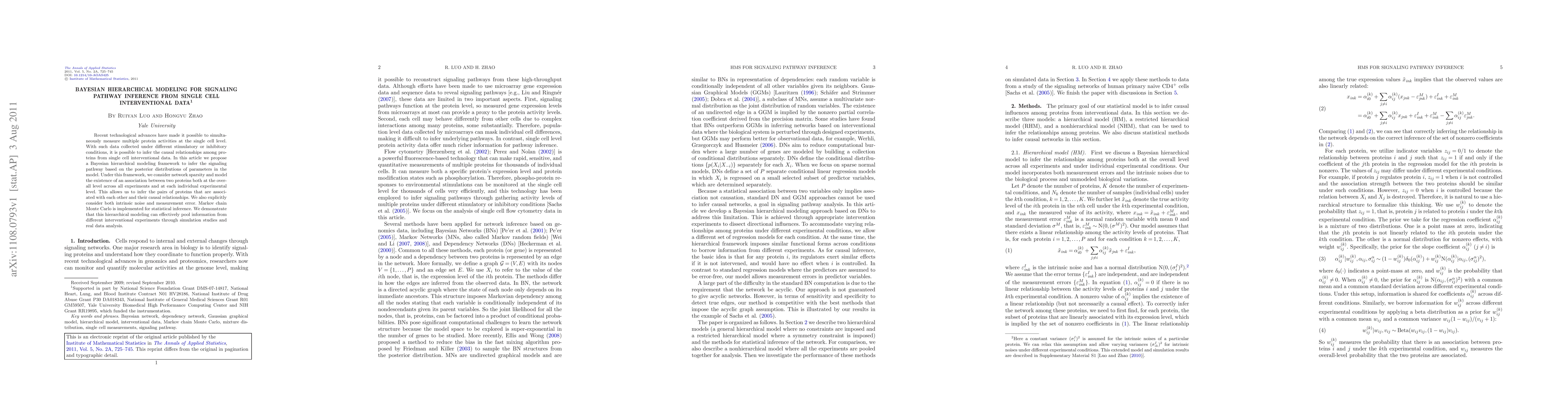 This paper proposes a Bayesian hierarchical modeling framework to infer signaling pathways from single cell interventional data, considering network sparsity and both intrinsic noise and measurement error. The method effectively pools information across experiments and infers causal relationships among proteins.