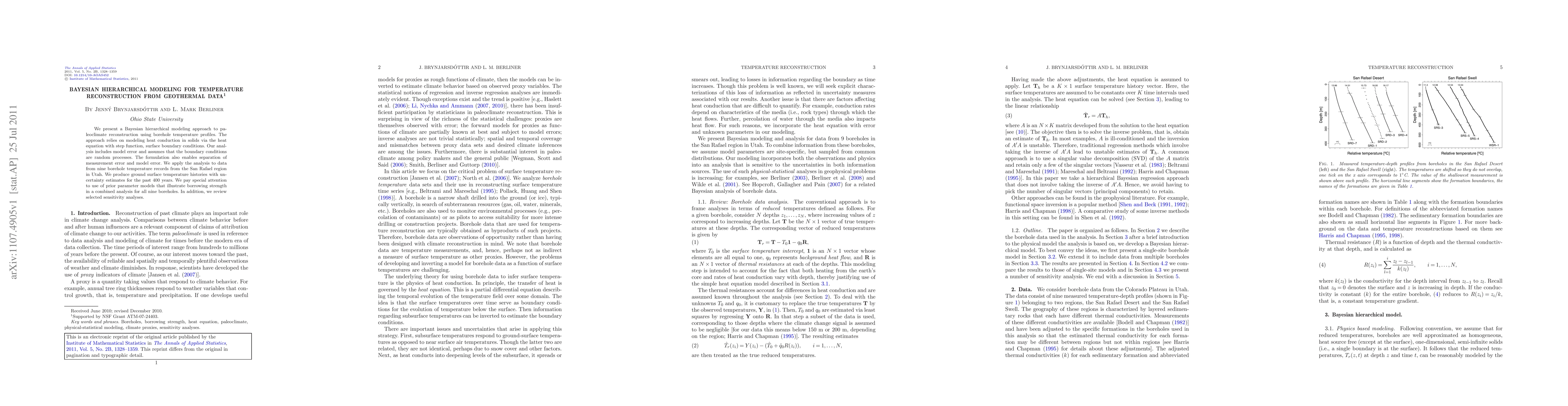 This paper introduces a Bayesian hierarchical modeling technique for reconstructing paleoclimate temperatures using geothermal borehole data. The method accounts for model and measurement errors and applies to nine boreholes in Utah, yielding temperature histories with uncertainties for the past 400 years, highlighting the benefits of combined analysis and prior parameter modeling.