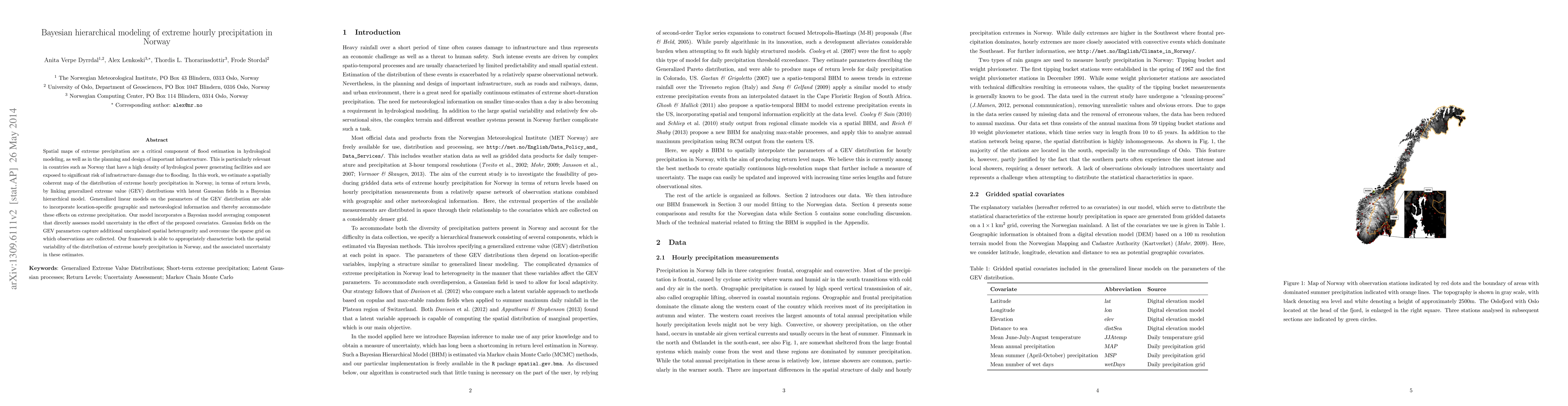 This paper develops a Bayesian hierarchical model to create a spatially coherent map of extreme hourly precipitation in Norway, using generalized extreme value distributions and latent Gaussian fields. The model incorporates geographic and meteorological data, capturing spatial variability and uncertainty in extreme precipitation estimates.