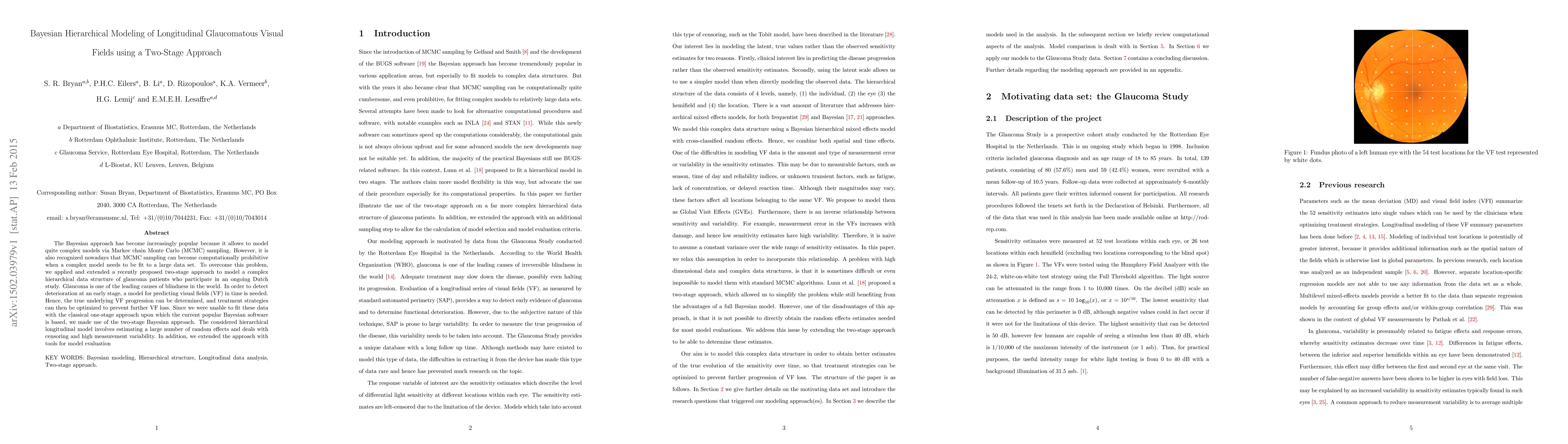The Bayesian approach has become increasingly popular because it allows to model quite complex models via Markov chain Monte Carlo (MCMC) sampling. However, it is also recognized nowadays that MCMC sampling can become computationally prohibitive when a complex model needs to be fit to a large data set. To overcome this problem, we applied and extended a recently proposed two-stage approach to model a complex hierarchical data structure of glaucoma patients who participate in an ongoing Dutch study. Glaucoma is one of the leading causes of blindness in the world. In order to detect deterioration at an early stage, a model for predicting visual fields (VF) in time is needed. Hence, the true underlying VF progression can be determined, and treatment strategies can then be optimized to prevent further VF loss. Since we were unable to fit these data with the classical one-stage approach upon which the current popular Bayesian software is based, we made use of the two-stage Bayesian approach. The considered hierarchical longitudinal model involves estimating a large number of random effects and deals with censoring and high measurement variability. In addition, we extended the approach with tools for model evaluation