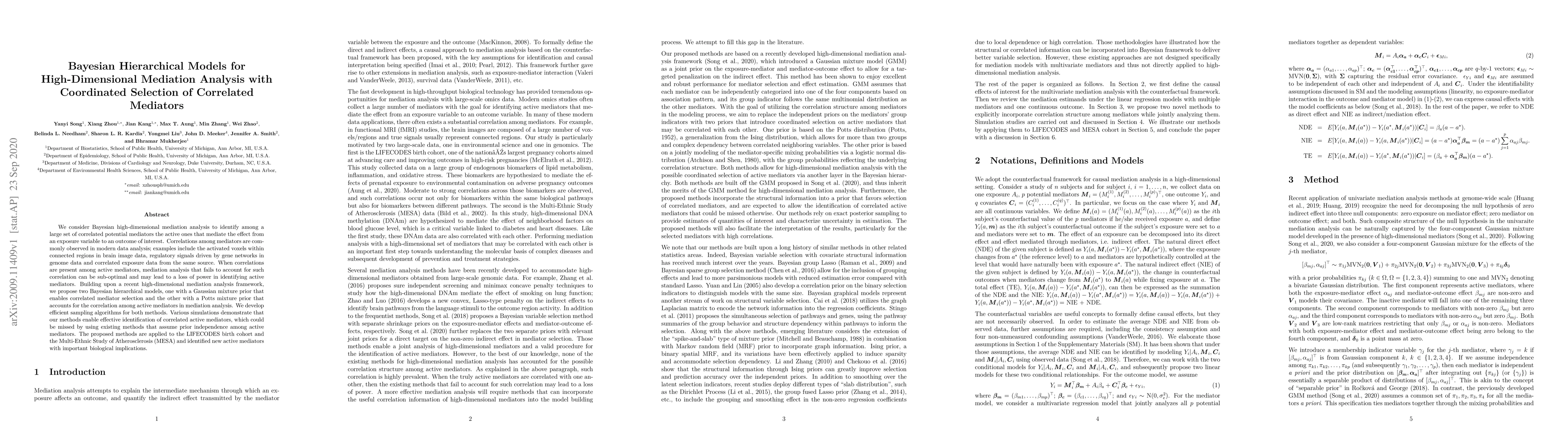 This paper proposes two Bayesian hierarchical models for high-dimensional mediation analysis to identify correlated active mediators from large datasets. The models, with Gaussian and Potts mixture priors, effectively account for mediator correlations, improving identification accuracy compared to methods assuming independence.