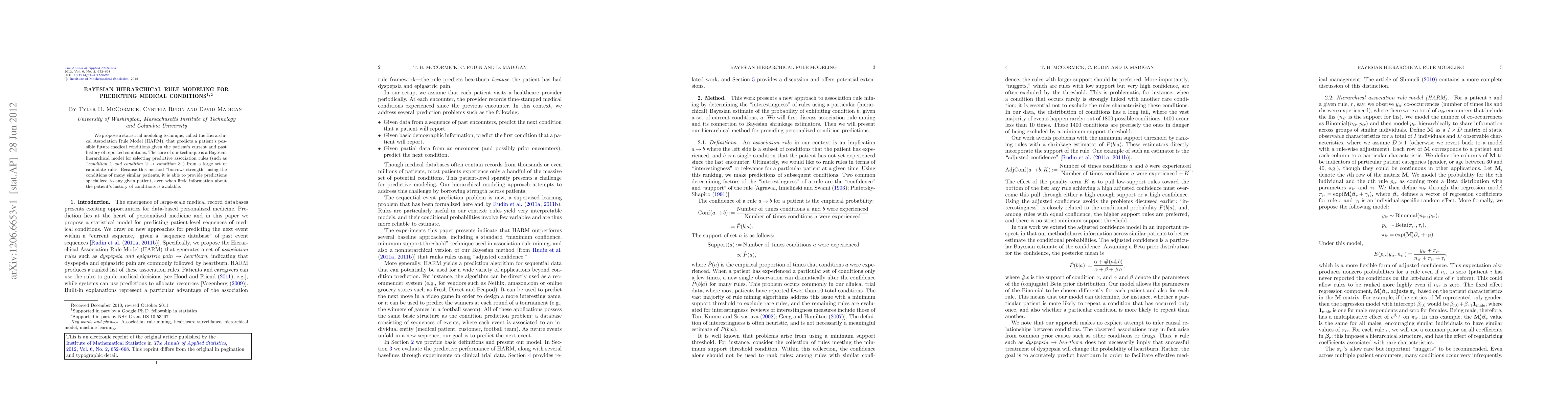 This paper introduces the Hierarchical Association Rule Model (HARM) for predicting future medical conditions based on patient history using a Bayesian hierarchical approach. The method effectively identifies predictive association rules from a large set, providing specialized predictions even with limited patient data.