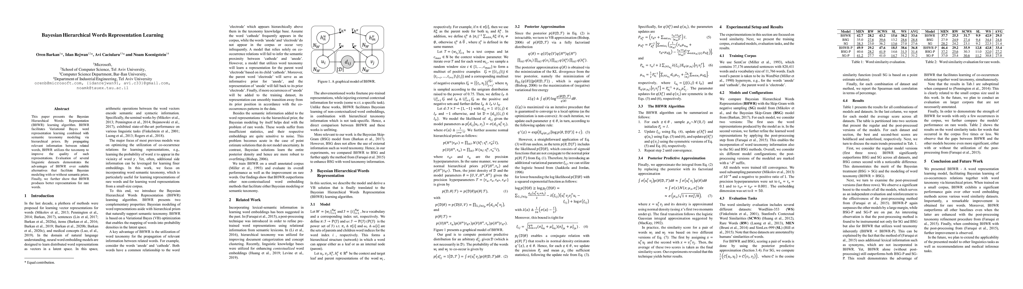 This paper introduces the Bayesian Hierarchical Words Representation (BHWR) learning algorithm, which combines Variational Bayes word representation learning with semantic taxonomy modeling using hierarchical priors to enhance representation quality. BHWR outperforms alternatives in linguistic dataset evaluations and particularly benefits rare words.