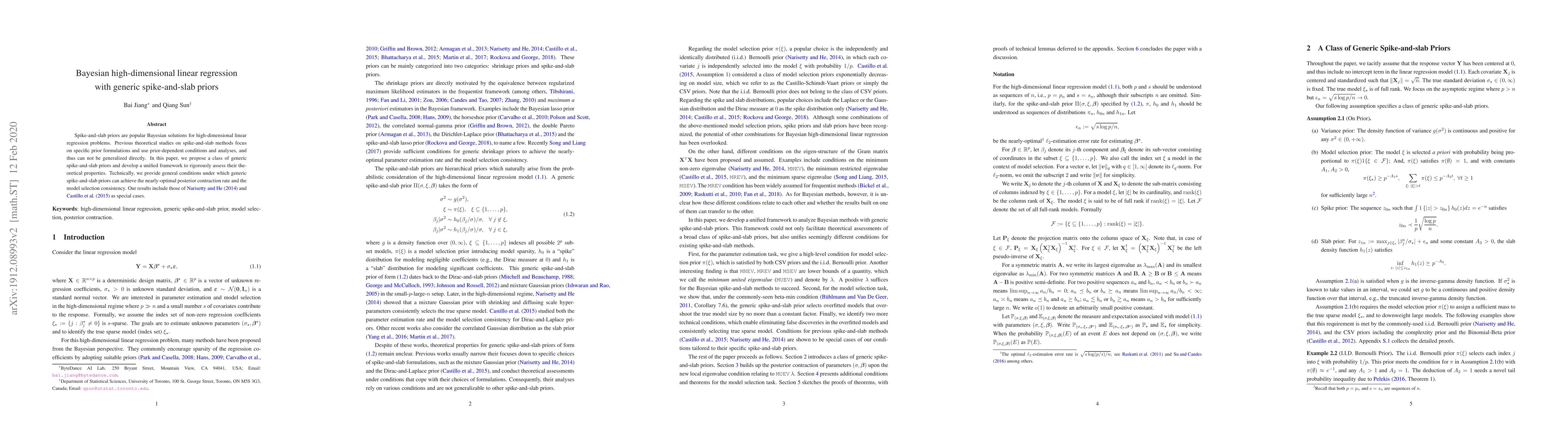 This paper introduces a class of generic spike-and-slab priors for high-dimensional linear regression, providing a unified framework to rigorously assess their theoretical properties. The authors establish general conditions for nearly-optimal posterior contraction rates and model selection consistency, encompassing previous specific prior studies.