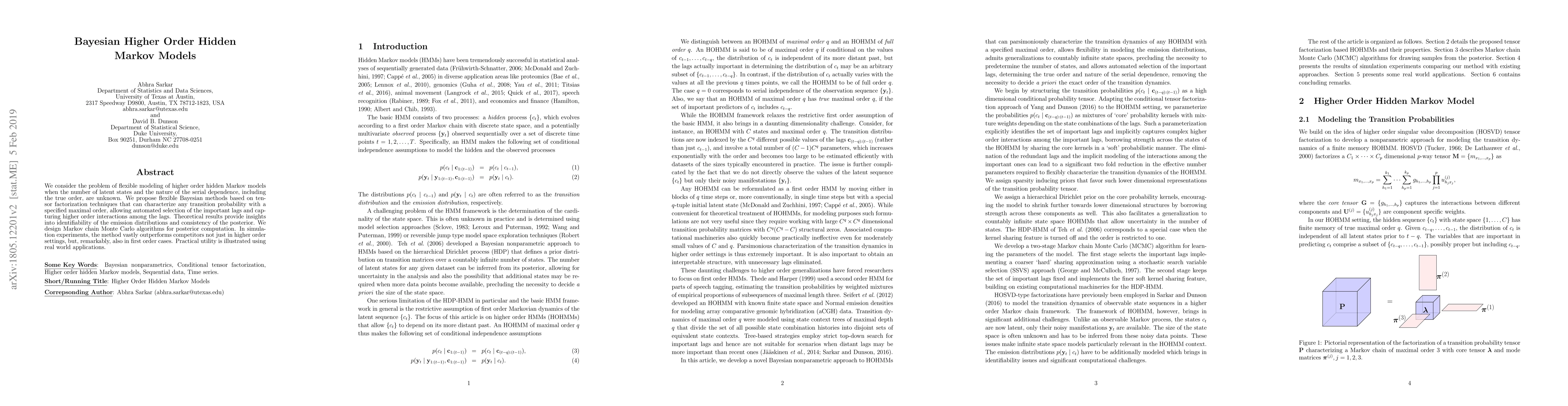 This paper introduces Bayesian nonparametric methodology for flexible modeling of higher order hidden Markov models, employing tensor factorization for automated selection of relevant lags and interactions. Simulation results show superior performance over existing methods, and real-world applications demonstrate practical utility.