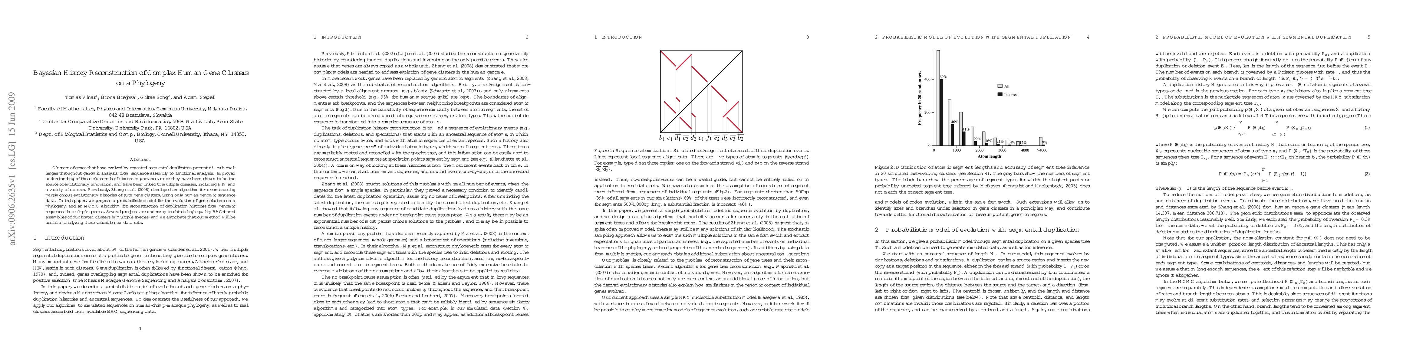 Clusters of genes that have evolved by repeated segmental duplication present difficult challenges throughout genomic analysis, from sequence assembly to functional analysis. Improved understanding of these clusters is of utmost importance, since they have been shown to be the source of evolutionary innovation, and have been linked to multiple diseases, including HIV and a variety of cancers. Previously, Zhang et al. (2008) developed an algorithm for reconstructing parsimonious evolutionary histories of such gene clusters, using only human genomic sequence data. In this paper, we propose a probabilistic model for the evolution of gene clusters on a phylogeny, and an MCMC algorithm for reconstruction of duplication histories from genomic sequences in multiple species. Several projects are underway to obtain high quality BAC-based assemblies of duplicated clusters in multiple species, and we anticipate that our method will be useful in analyzing these valuable new data sets.