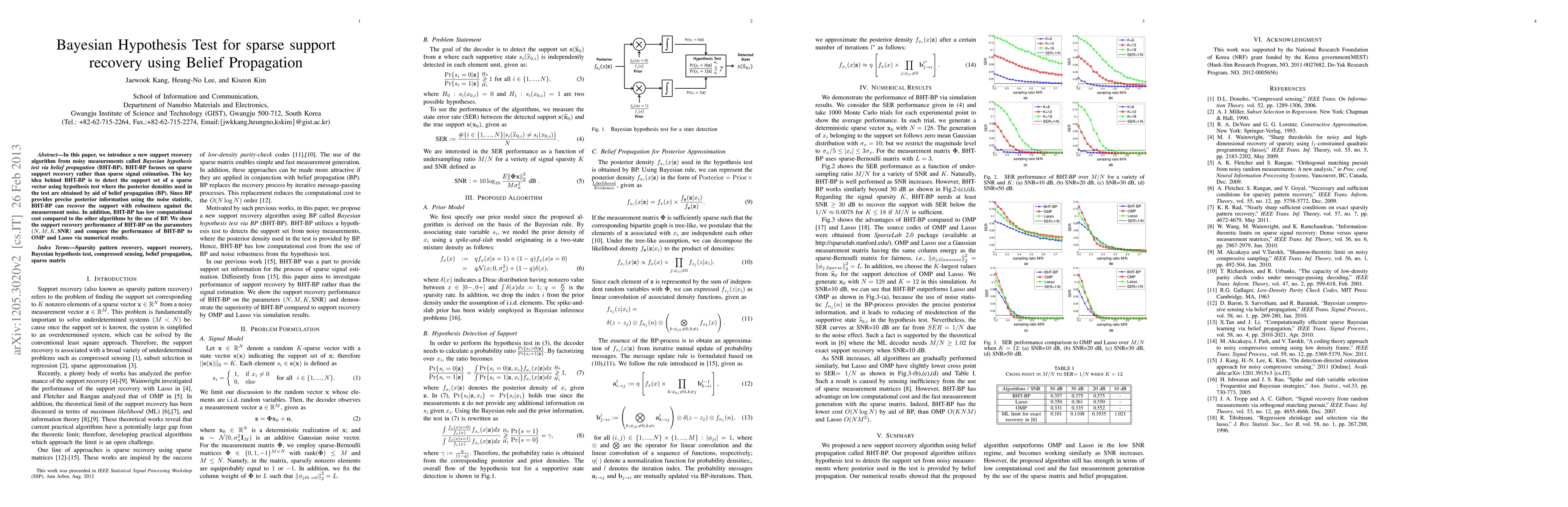 This paper proposes a new Bayesian hypothesis test via belief propagation (BHT-BP) algorithm for sparse support recovery from noisy measurements. BHT-BP uses belief propagation to obtain precise posterior densities for hypothesis testing, enabling robust support recovery with lower computational costs compared to OMP and Lasso.