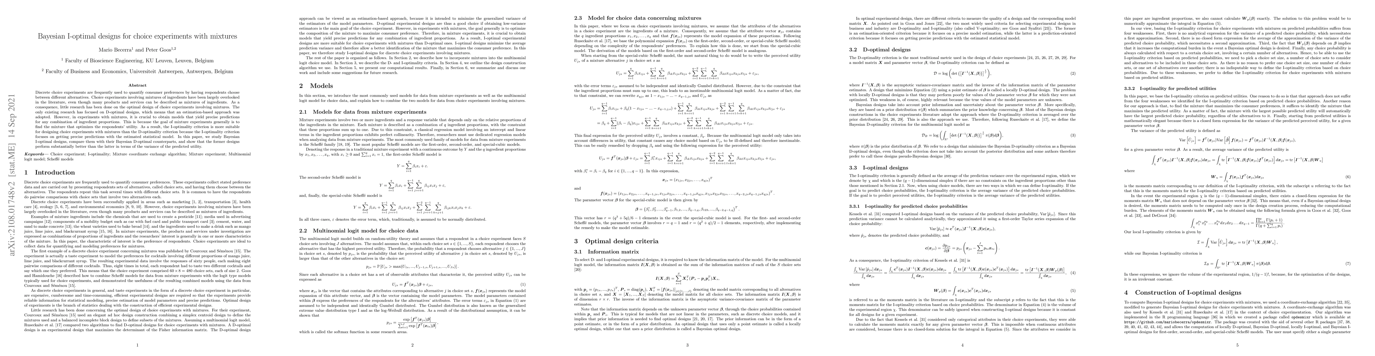 This paper proposes Bayesian I-optimal designs for choice experiments involving mixtures, demonstrating their superiority over Bayesian D-optimal designs in terms of prediction precision for any combination of ingredient proportions, which is crucial for optimizing consumer utility.