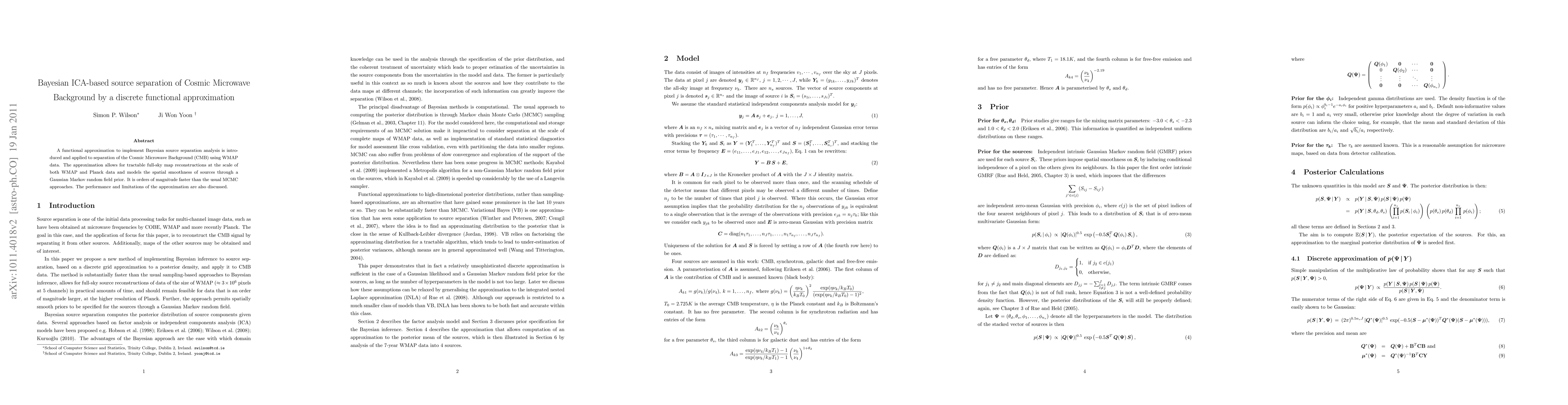 This paper introduces a Bayesian ICA-based method using a discrete functional approximation for separating the Cosmic Microwave Background (CMB) from WMAP data, achieving faster full-sky map reconstructions compared to traditional MCMC methods while modeling spatial smoothness through a Gaussian Markov random field prior. The method's performance and limitations are thoroughly analyzed.
