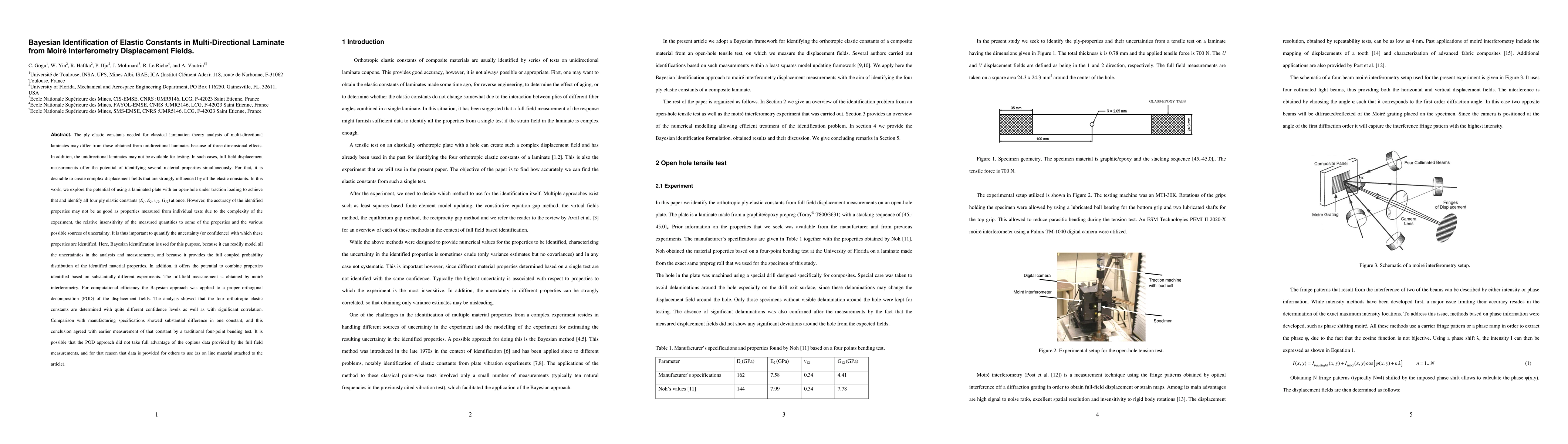 This paper uses Bayesian identification and full-field displacement measurements from moiré interferometry to determine the four orthotropic elastic constants of multi-directional laminates. The method reveals significant differences in identified constants compared to traditional tests, highlighting the importance of quantifying uncertainties in the analysis.