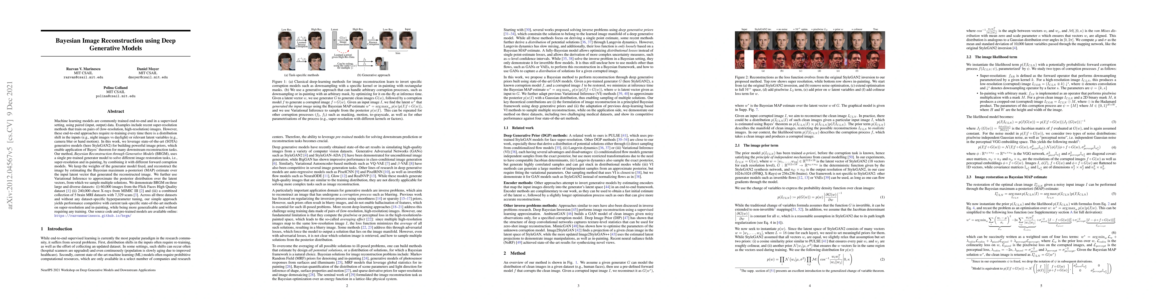 Machine learning models are commonly trained end-to-end and in a supervised setting, using paired (input, output) data. Examples include recent super-resolution methods that train on pairs of (low-resolution, high-resolution) images. However, these end-to-end approaches require re-training every time there is a distribution shift in the inputs (e.g., night images vs daylight) or relevant latent variables (e.g., camera blur or hand motion). In this work, we leverage state-of-the-art (SOTA) generative models (here StyleGAN2) for building powerful image priors, which enable application of Bayes' theorem for many downstream reconstruction tasks. Our method, Bayesian Reconstruction through Generative Models (BRGM), uses a single pre-trained generator model to solve different image restoration tasks, i.e., super-resolution and in-painting, by combining it with different forward corruption models. We keep the weights of the generator model fixed, and reconstruct the image by estimating the Bayesian maximum a-posteriori (MAP) estimate over the input latent vector that generated the reconstructed image. We further use variational inference to approximate the posterior distribution over the latent vectors, from which we sample multiple solutions. We demonstrate BRGM on three large and diverse datasets: (i) 60,000 images from the Flick Faces High Quality dataset (ii) 240,000 chest X-rays from MIMIC III and (iii) a combined collection of 5 brain MRI datasets with 7,329 scans. Across all three datasets and without any dataset-specific hyperparameter tuning, our simple approach yields performance competitive with current task-specific state-of-the-art methods on super-resolution and in-painting, while being more generalisable and without requiring any training. Our source code and pre-trained models are available online: https://razvanmarinescu.github.io/brgm/.
