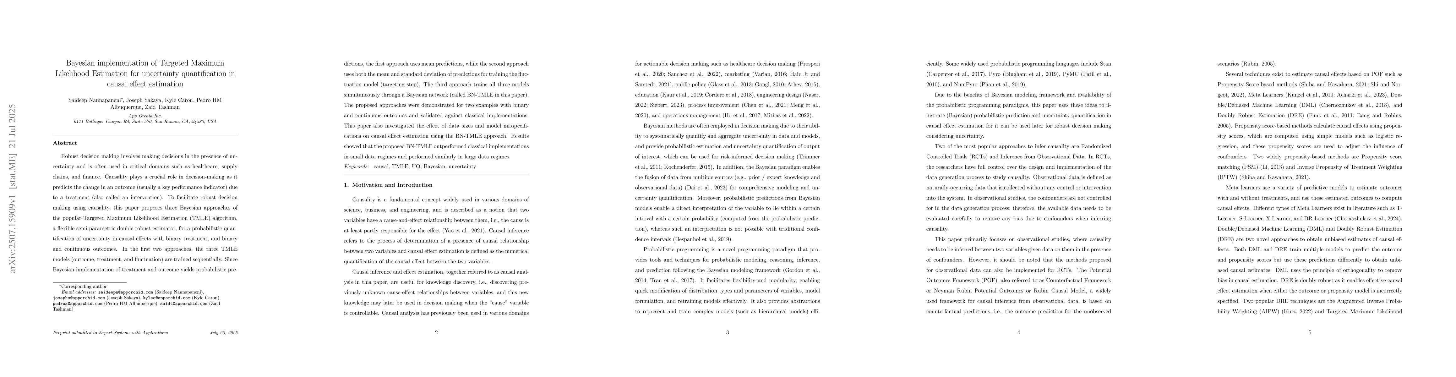 Robust decision making involves making decisions in the presence of uncertainty and is often used in critical domains such as healthcare, supply chains, and finance. Causality plays a crucial role in decision-making as it predicts the change in an outcome (usually a key performance indicator) due to a treatment (also called an intervention). To facilitate robust decision making using causality, this paper proposes three Bayesian approaches of the popular Targeted Maximum Likelihood Estimation (TMLE) algorithm, a flexible semi-parametric double robust estimator, for a probabilistic quantification of uncertainty in causal effects with binary treatment, and binary and continuous outcomes. In the first two approaches, the three TMLE models (outcome, treatment, and fluctuation) are trained sequentially. Since Bayesian implementation of treatment and outcome yields probabilistic predictions, the first approach uses mean predictions, while the second approach uses both the mean and standard deviation of predictions for training the fluctuation model (targeting step). The third approach trains all three models simultaneously through a Bayesian network (called BN-TMLE in this paper). The proposed approaches were demonstrated for two examples with binary and continuous outcomes and validated against classical implementations. This paper also investigated the effect of data sizes and model misspecifications on causal effect estimation using the BN-TMLE approach. Results showed that the proposed BN-TMLE outperformed classical implementations in small data regimes and performed similarly in large data regimes.