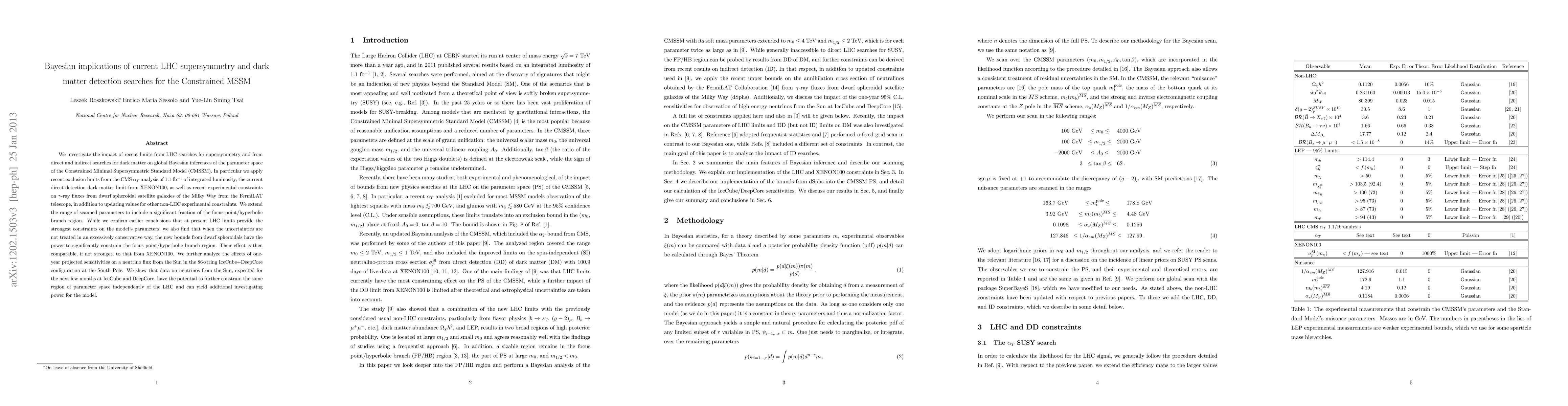 We investigate the impact of recent limits from LHC searches for supersymmetry and from direct and indirect searches for dark matter on global Bayesian inferences of the parameter space of the Constrained Minimal Supersymmetric Standard Model (CMSSM). In particular we apply recent exclusion limits from the CMS \alpha_T analysis of 1.1/fb of integrated luminosity, the current direct detection dark matter limit from XENON100, as well as recent experimental constraints on \gamma-ray fluxes from dwarf spheroidal satellite galaxies of the Milky Way from the FermiLAT telescope, in addition to updating values for other non-LHC experimental constraints. We extend the range of scanned parameters to include a significant fraction of the focus point/hyperbolic branch region. While we confirm earlier conclusions that at present LHC limits provide the strongest constraints on the model's parameters, we also find that when the uncertainties are not treated in an excessively conservative way, the new bounds from dwarf spheroidal have the power to significantly constrain the focus point/hyperbolic branch region. Their effect is then comparable, if not stronger, to that from XENON100. We further analyze the effects of one-year projected sensitivities on the neutrino flux from the Sun in the 86-string IceCube+DeepCore configuration at the South Pole. We show that data on neutrinos from the Sun, expected for the next few months at IceCube and DeepCore, have the potential to further constrain the same region of parameter space independently of the LHC and can yield additional investigating power for the model.