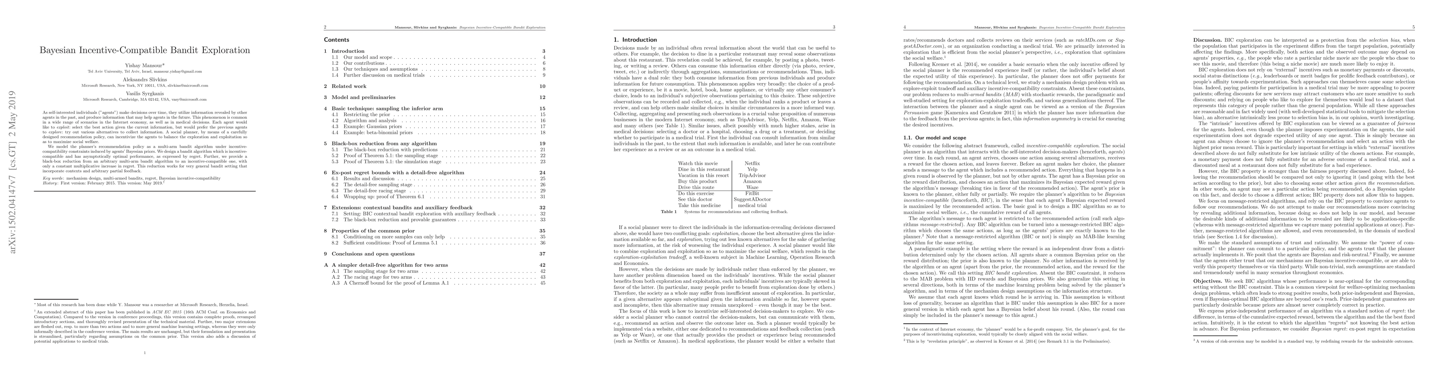 Individual decision-makers consume information revealed by the previous decision makers, and produce information that may help in future decisions. This phenomenon is common in a wide range of scenarios in the Internet economy, as well as in other domains such as medical decisions. Each decision-maker would individually prefer to "exploit": select an action with the highest expected reward given her current information. At the same time, each decision-maker would prefer previous decision-makers to "explore", producing information about the rewards of various actions. A social planner, by means of carefully designed information disclosure, can incentivize the agents to balance the exploration and exploitation so as to maximize social welfare. We formulate this problem as a multi-armed bandit problem (and various generalizations thereof) under incentive-compatibility constraints induced by the agents' Bayesian priors. We design an incentive-compatible bandit algorithm for the social planner whose regret is asymptotically optimal among all bandit algorithms (incentive-compatible or not). Further, we provide a black-box reduction from an arbitrary multi-arm bandit algorithm to an incentive-compatible one, with only a constant multiplicative increase in regret. This reduction works for very general bandit setting that incorporate contexts and arbitrary auxiliary feedback.