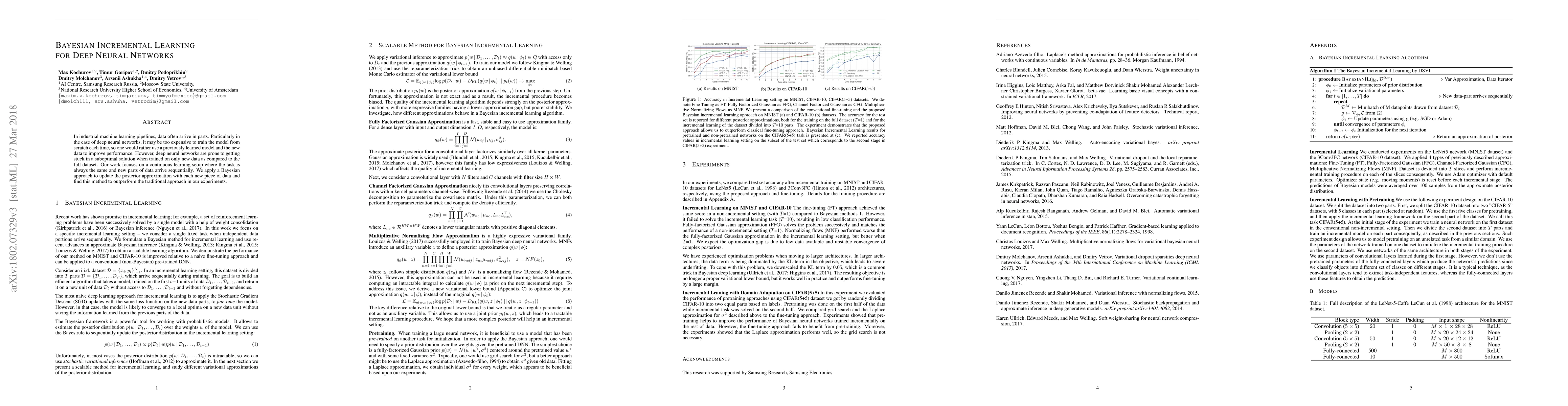 This paper proposes a Bayesian incremental learning method for deep neural networks to continuously update models with new data sequentially, avoiding the pitfalls of suboptimal solutions when training on only new data. Experimental results show that this approach outperforms traditional methods in maintaining and improving model performance over time.