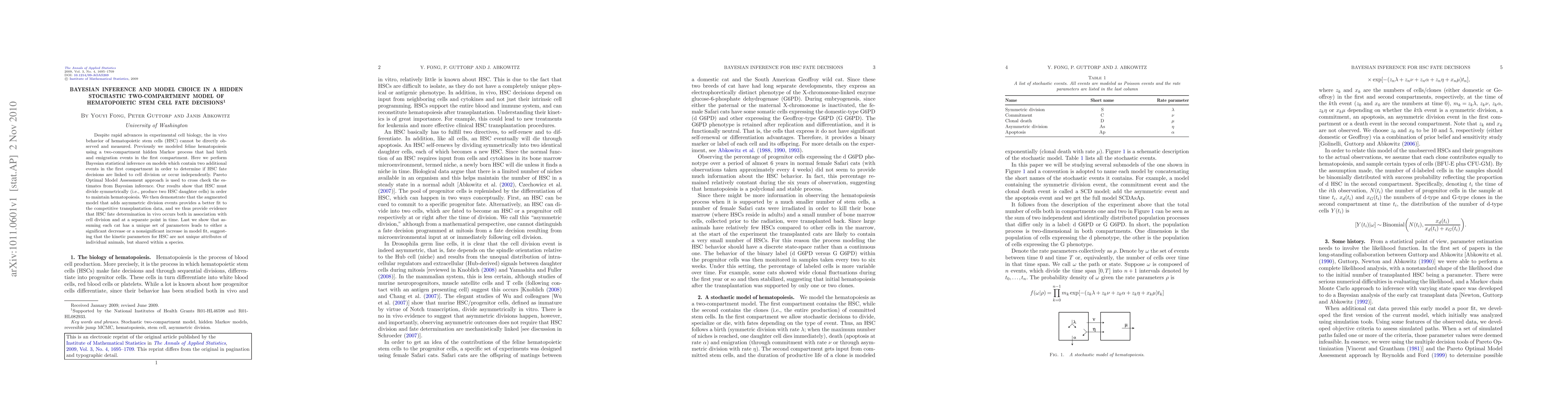 This paper uses Bayesian inference to evaluate a hidden stochastic two-compartment model of hematopoietic stem cell (HSC) fate decisions, finding that HSC must divide symmetrically to maintain hematopoiesis. The study also demonstrates that HSC fate determination involves both cell division and a separate timing mechanism, and that HSC parameters are shared within a species rather than unique to individual animals.
