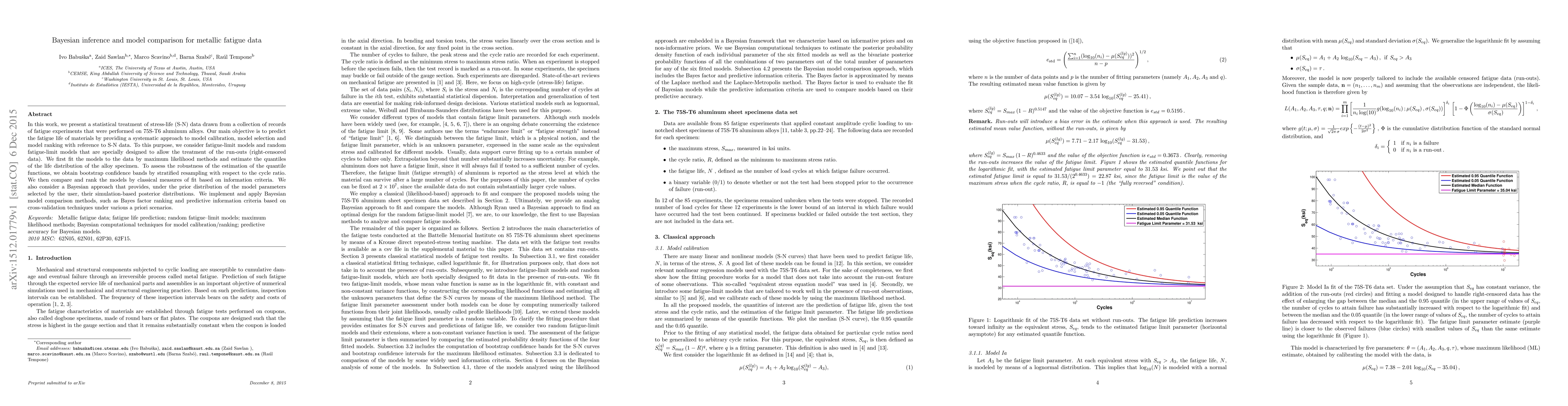 This paper uses Bayesian inference and model comparison techniques to analyze stress-life (S-N) data from fatigue experiments on 75S-T6 aluminum alloys, aiming to predict material fatigue life. It employs both classical and Bayesian methods to fit, compare, and rank fatigue-limit models, providing robust estimates and confidence bands.