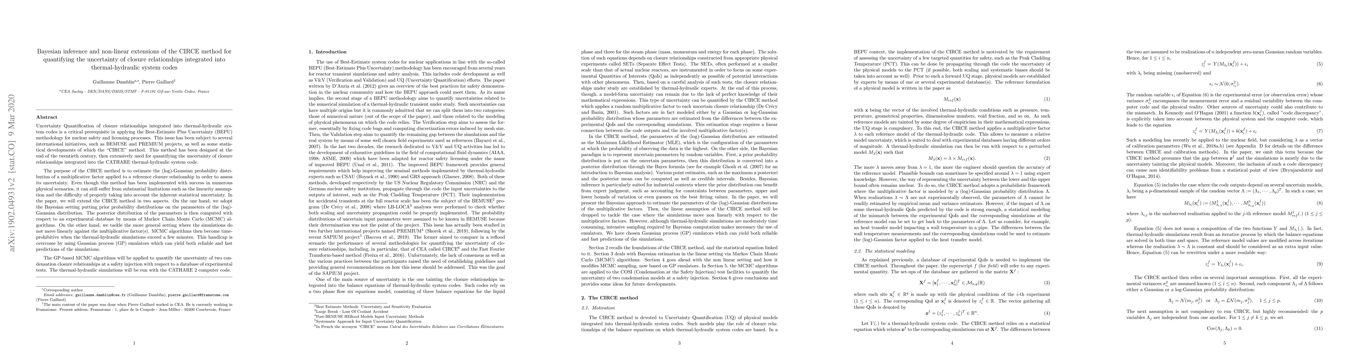 Uncertainty Quantification of closure relationships integrated into thermal-hydraulic system codes is a critical prerequisite in applying the Best-Estimate Plus Uncertainty (BEPU) methodology for nuclear safety and licensing processes.The purpose of the CIRCE method is to estimate the (log)-Gaussian probability distribution of a multiplicative factor applied to a reference closure relationship in order to assess its uncertainty. Even though this method has been implemented with success in numerous physical scenarios, it can still suffer from substantial limitations such as the linearity assumption and the difficulty of properly taking into account the inherent statistical uncertainty. In the paper, we will extend the CIRCE method in two aspects. On the one hand, we adopt the Bayesian setting putting prior probability distributions on the parameters of the (log)-Gaussian distribution. The posterior distribution of the parameters is then computed with respect to an experimental database by means of Markov Chain Monte Carlo (MCMC) algorithms. On the other hand, we tackle the more general setting where the simulations do not move linearly against the multiplicative factor(s). MCMC algorithms then become time-prohibitive when the thermal-hydraulic simulations exceed a few minutes. This handicap is overcome by using Gaussian process (GP) emulators which can yield both reliable and fast predictions of the simulations. The GP-based MCMC algorithms will be applied to quantify the uncertainty of two condensation closure relationships at a safety injection with respect to a database of experimental tests. The thermal-hydraulic simulations will be run with the CATHARE 2 computer code.