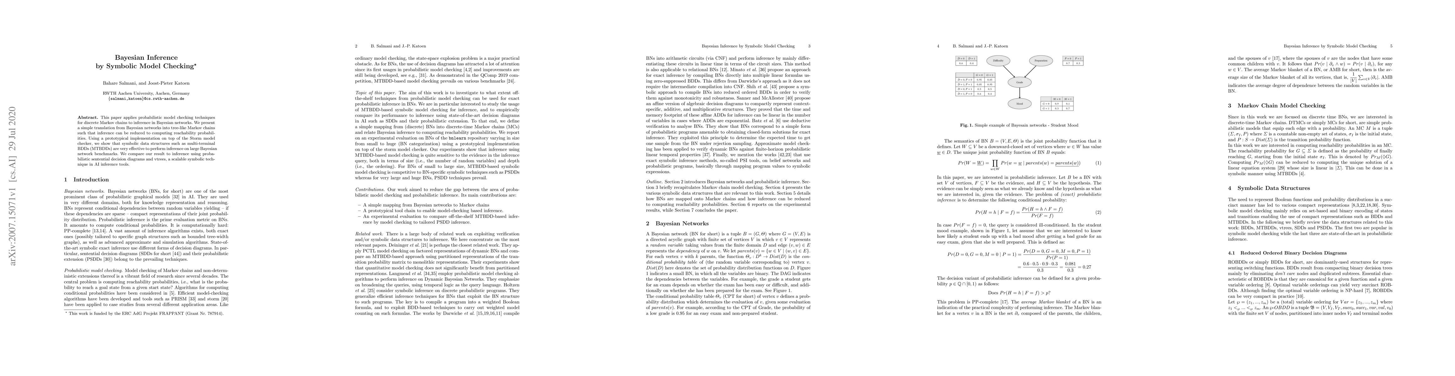 The paper applies probabilistic model checking techniques for discrete Markov chains to inference in Bayesian networks, translating Bayesian networks into tree-like Markov chains for symbolic model checking using MTBDDs and comparing with PSDD techniques.