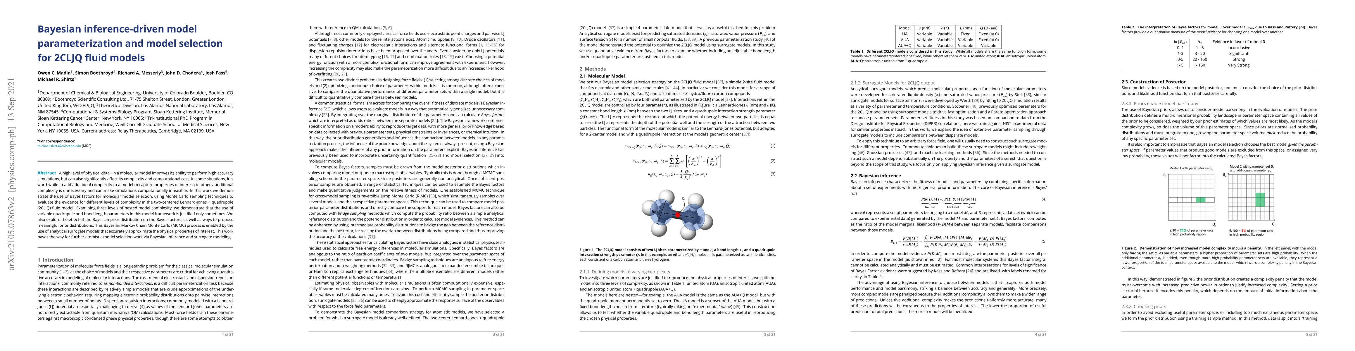A high level of physical detail in a molecular model improves its ability to perform high accuracy simulations, but can also significantly affect its complexity and computational cost. In some situations, it is worthwhile to add additional complexity to a model to capture properties of interest; in others, additional complexity is unnecessary and can make simulations computationally infeasible. In this work we demonstrate the use of Bayes factors for molecular model selection, using Monte Carlo sampling techniques to evaluate the evidence for different levels of complexity in the two-centered Lennard-Jones + quadrupole (2CLJQ) fluid model. Examining three levels of nested model complexity, we demonstrate that the use of variable quadrupole and bond length parameters in this model framework is justified only sometimes. We also explore the effect of the Bayesian prior distribution on the Bayes factors, as well as ways to propose meaningful prior distributions. This Bayesian Markov Chain Monte Carlo (MCMC) process is enabled by the use of analytical surrogate models that accurately approximate the physical properties of interest. This work paves the way for further atomistic model selection work via Bayesian inference and surrogate modeling