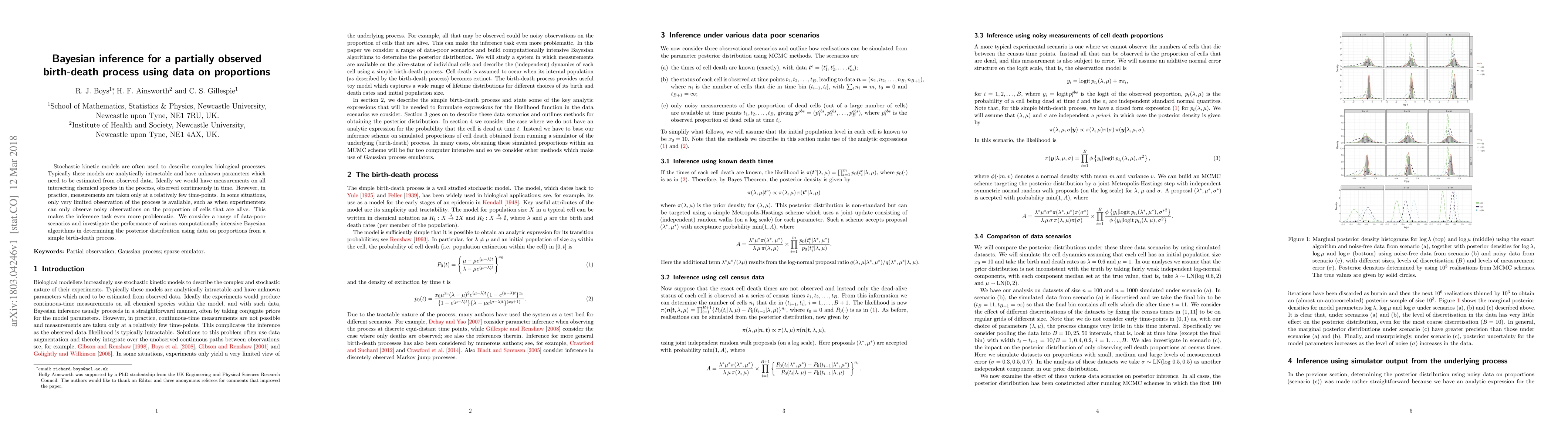 This paper explores Bayesian inference methods for estimating parameters in a partially observed birth-death process, using noisy data on the proportions of alive cells. It investigates the performance of various computationally intensive Bayesian algorithms in such data-poor scenarios.
