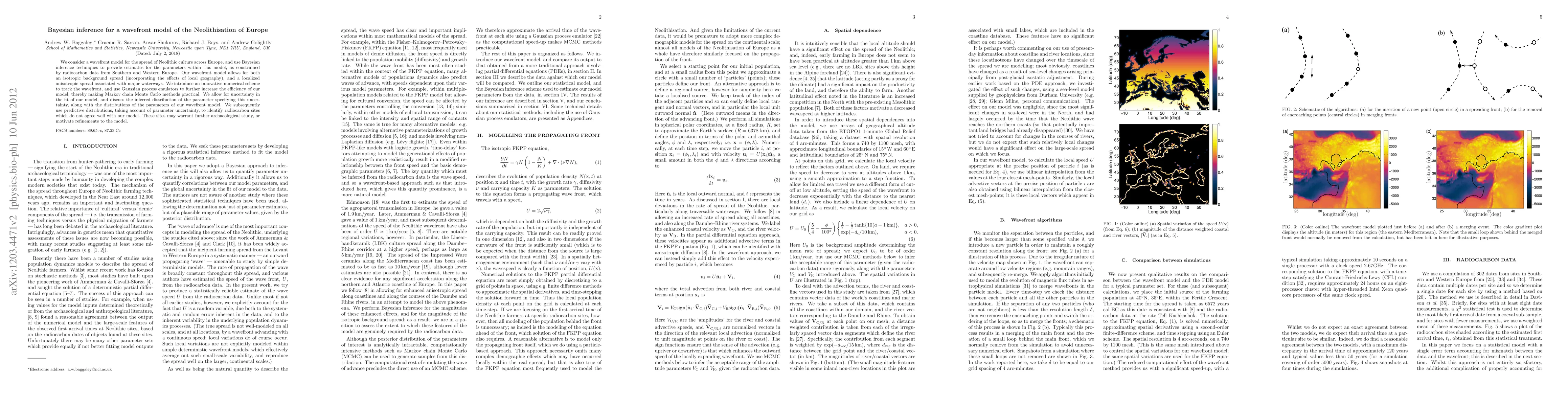 We consider a wavefront model for the spread of Neolithic culture across Europe, and use Bayesian inference techniques to provide estimates for the parameters within this model, as constrained by radiocarbon data from Southern and Western Europe. Our wavefront model allows for both an isotropic background spread (incorporating the effects of local geography), and a localized anisotropic spread associated with major waterways. We introduce an innovative numerical scheme to track the wavefront, and use Gaussian process emulators to further increase the efficiency of our model, thereby making Markov chain Monte Carlo methods practical. We allow for uncertainty in the fit of our model, and discuss the inferred distribution of the parameter specifying this uncertainty, along with the distributions of the parameters of our wavefront model. We subsequently use predictive distributions, taking account of parameter uncertainty, to identify radiocarbon sites which do not agree well with our model. These sites may warrant further archaeological study, or motivate refinements to the model.