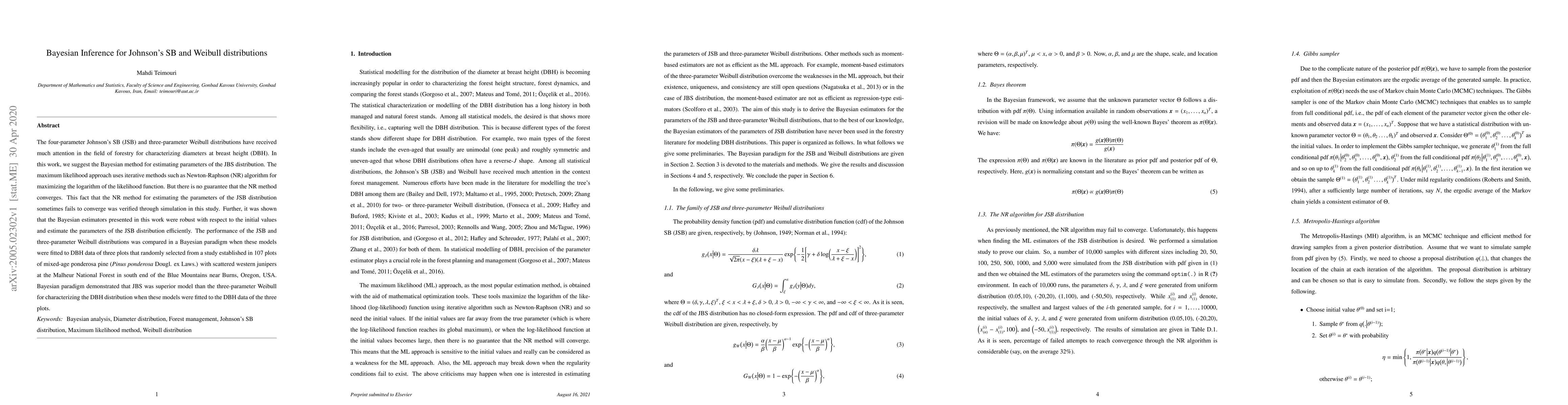 The four-parameter Johnson's SB (JSB) and three-parameter Weibull distributions have received much attention in the field of forestry for characterizing diameters at breast height (DBH). In this work, we suggest the Bayesian method for estimating parameters of the JBS distribution. The maximum likelihood approach uses iterative methods such as Newton-Raphson (NR) algorithm for maximizing the logarithm of the likelihood function. But there is no guarantee that the NR method converges. This fact that the NR method for estimating the parameters of the JSB distribution sometimes fails to converge was verified through simulation in this study. Further, it was shown that the Bayesian estimators presented in this work were robust with respect to the initial values and estimate the parameters of the JSB distribution efficiently. The performance of the JSB and three-parameter Weibull distributions was compared in a Bayesian paradigm when these models were fitted to DBH data of three plots that randomly selected from a study established in 107 plots of mixed-age ponderosa pine (Pinus ponderosa Dougl. ex Laws.) with scattered western junipers at the Malheur National Forest in south end of the Blue Mountains near Burns, Oregon, USA. Bayesian paradigm demonstrated that JBS was superior model than the three-parameter Weibull for characterizing the DBH distribution when these models were fitted to the DBH data of the three plots.