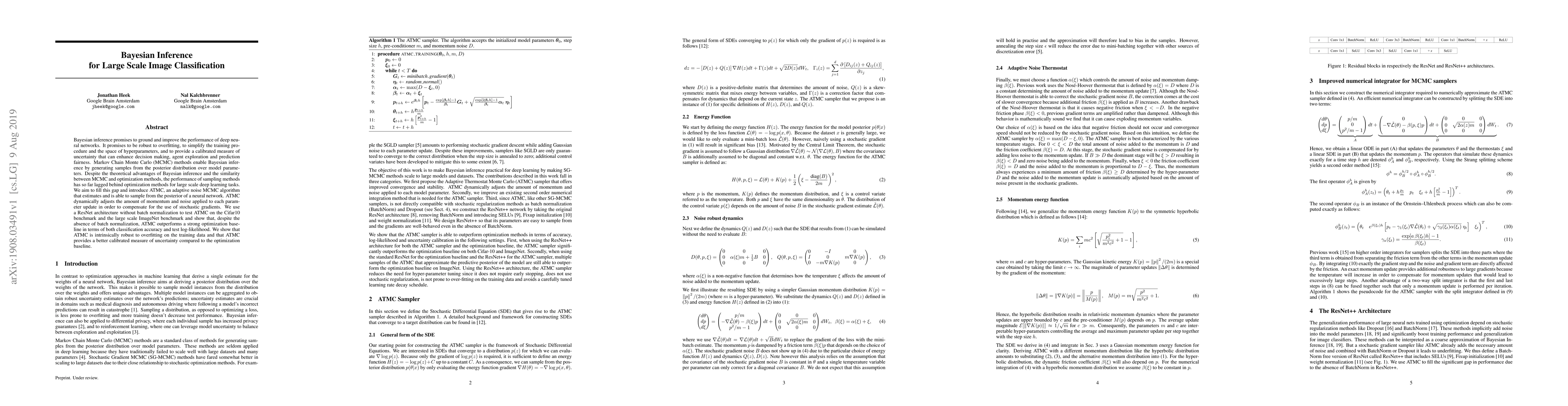 Bayesian inference promises to ground and improve the performance of deep neural networks. It promises to be robust to overfitting, to simplify the training procedure and the space of hyperparameters, and to provide a calibrated measure of uncertainty that can enhance decision making, agent exploration and prediction fairness. Markov Chain Monte Carlo (MCMC) methods enable Bayesian inference by generating samples from the posterior distribution over model parameters. Despite the theoretical advantages of Bayesian inference and the similarity between MCMC and optimization methods, the performance of sampling methods has so far lagged behind optimization methods for large scale deep learning tasks. We aim to fill this gap and introduce ATMC, an adaptive noise MCMC algorithm that estimates and is able to sample from the posterior of a neural network. ATMC dynamically adjusts the amount of momentum and noise applied to each parameter update in order to compensate for the use of stochastic gradients. We use a ResNet architecture without batch normalization to test ATMC on the Cifar10 benchmark and the large scale ImageNet benchmark and show that, despite the absence of batch normalization, ATMC outperforms a strong optimization baseline in terms of both classification accuracy and test log-likelihood. We show that ATMC is intrinsically robust to overfitting on the training data and that ATMC provides a better calibrated measure of uncertainty compared to the optimization baseline.