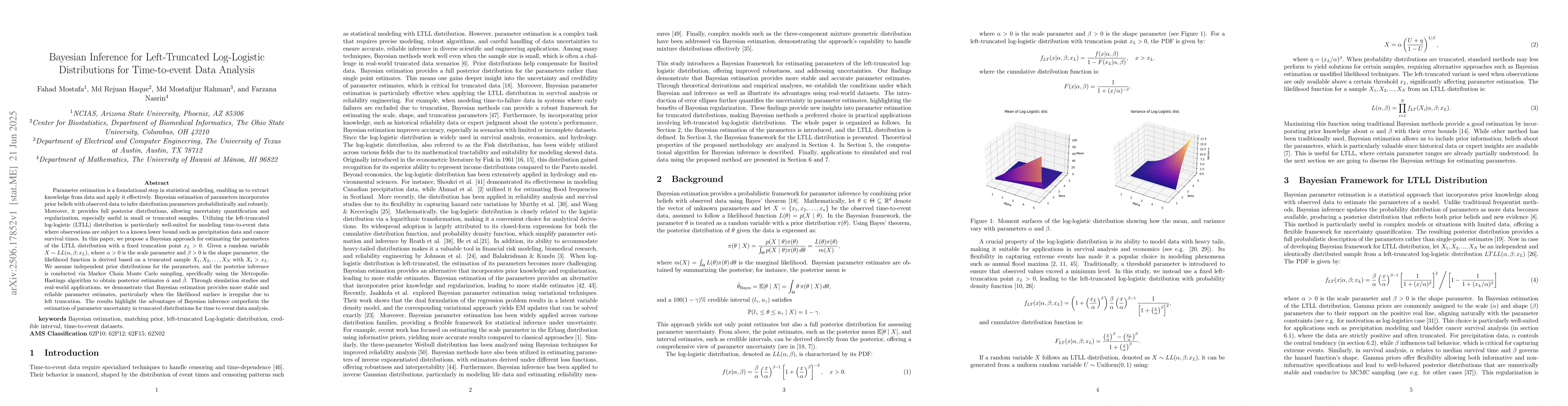Parameter estimation is a foundational step in statistical modeling, enabling us to extract knowledge from data and apply it effectively. Bayesian estimation of parameters incorporates prior beliefs with observed data to infer distribution parameters probabilistically and robustly. Moreover, it provides full posterior distributions, allowing uncertainty quantification and regularization, especially useful in small or truncated samples. Utilizing the left-truncated log-logistic (LTLL) distribution is particularly well-suited for modeling time-to-event data where observations are subject to a known lower bound such as precipitation data and cancer survival times. In this paper, we propose a Bayesian approach for estimating the parameters of the LTLL distribution with a fixed truncation point \( x_L > 0 \). Given a random variable \( X \sim LL(\alpha, \beta; x_L) \), where \( \alpha > 0 \) is the scale parameter and \( \beta > 0 \) is the shape parameter, the likelihood function is derived based on a truncated sample \( X_1, X_2, \dots, X_N \) with \( X_i > x_L \). We assume independent prior distributions for the parameters, and the posterior inference is conducted via Markov Chain Monte Carlo sampling, specifically using the Metropolis-Hastings algorithm to obtain posterior estimates \( \hat{\alpha} \) and \( \hat{\beta} \). Through simulation studies and real-world applications, we demonstrate that Bayesian estimation provides more stable and reliable parameter estimates, particularly when the likelihood surface is irregular due to left truncation. The results highlight the advantages of Bayesian inference outperform the estimation of parameter uncertainty in truncated distributions for time to event data analysis.