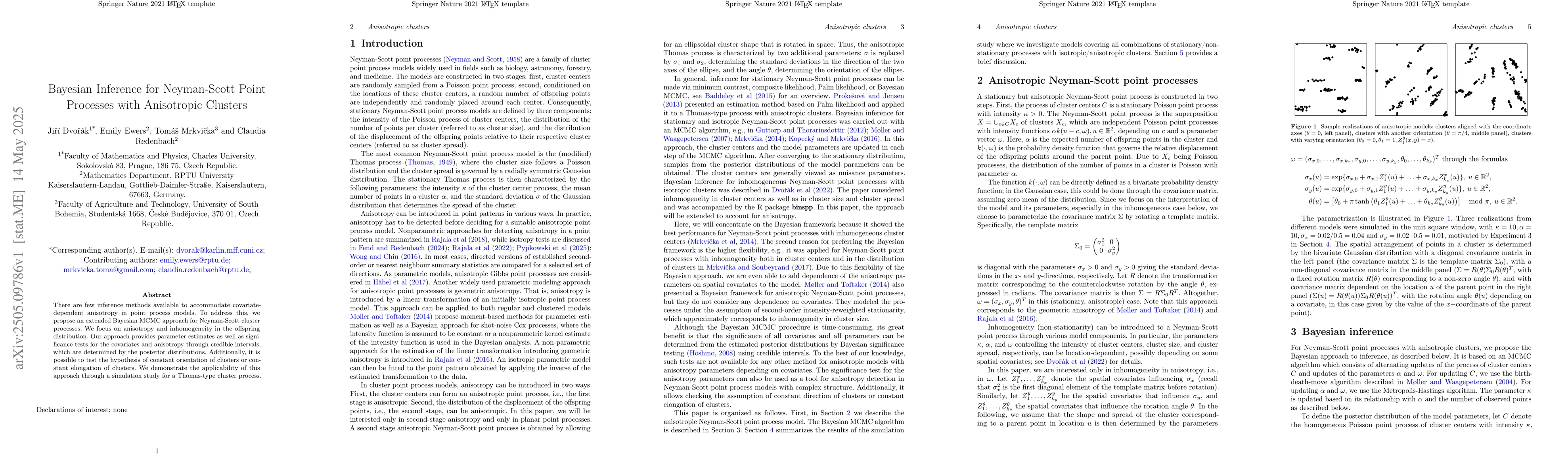 The main technical contribution is the extension of Bayesian MCMC methods to accommodate anisotropic clusters in Neyman-Scott point processes, providing a robust framework for parameter estimation and hypothesis testing.