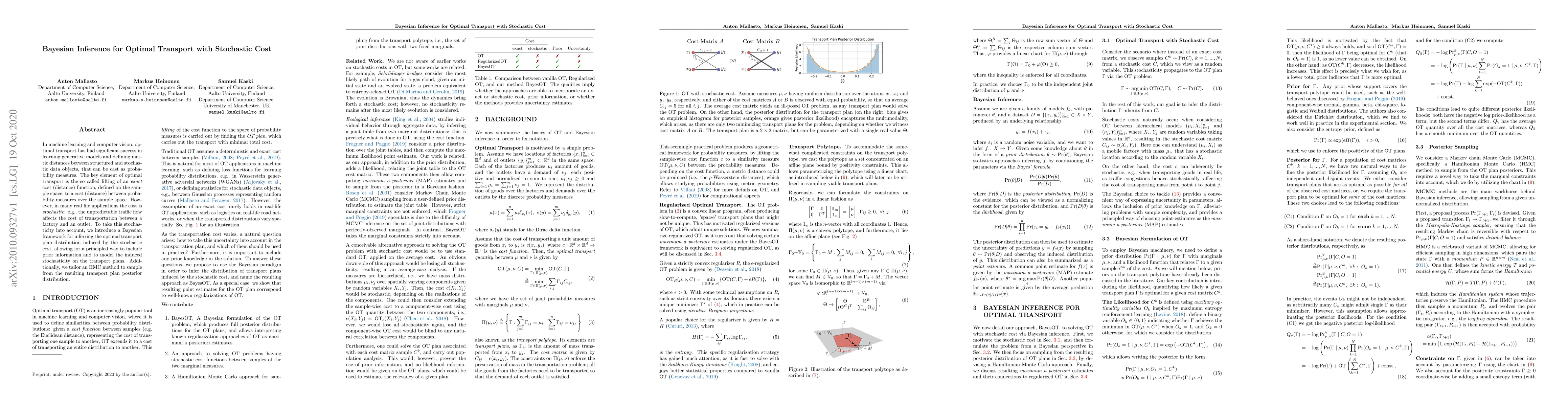 A new Bayesian framework is introduced to infer optimal transport plans with stochastic costs, allowing for prior information and modeling of induced stochasticity. The method uses a Hamiltonian Monte Carlo approach to sample from the posterior distribution of transport plan distributions.