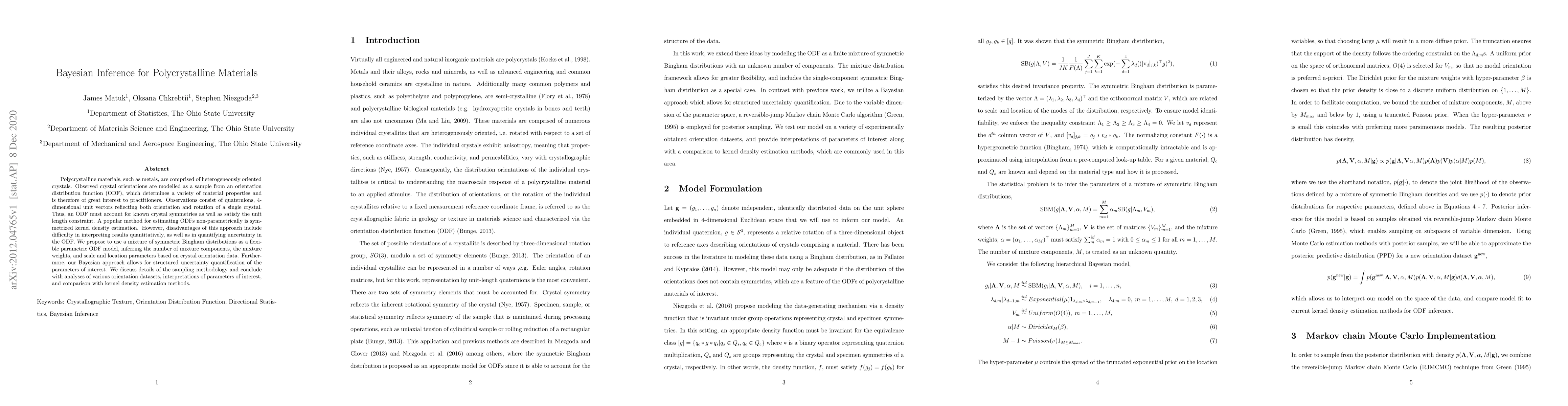 This paper proposes a Bayesian method using a mixture of symmetric Bingham distributions to model orientation distribution functions (ODFs) for polycrystalline materials, addressing the limitations of non-parametric approaches like kernel density estimation. The method allows for structured uncertainty quantification and is demonstrated through analyses of crystal orientation data.