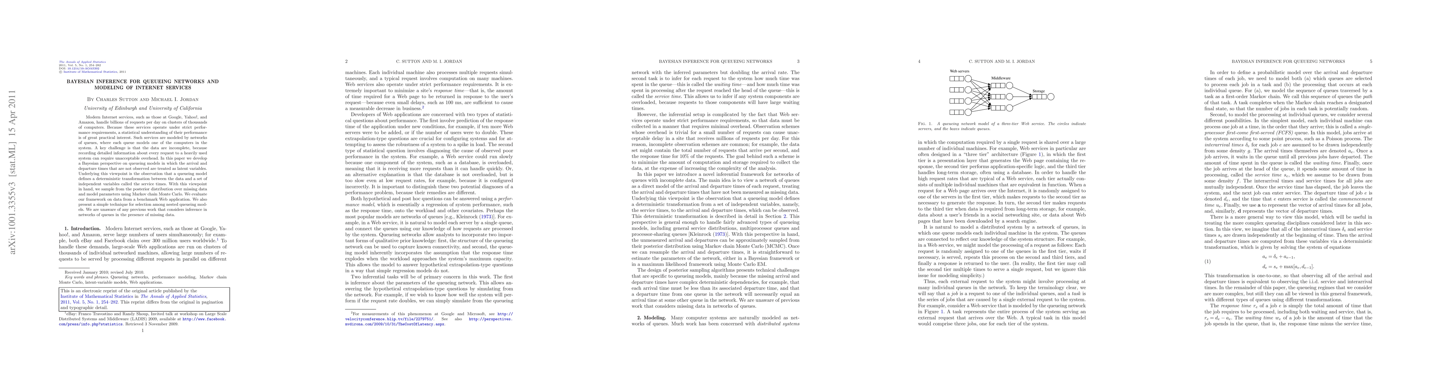 Modern Internet services, such as those at Google, Yahoo!, and Amazon, handle billions of requests per day on clusters of thousands of computers. Because these services operate under strict performance requirements, a statistical understanding of their performance is of great practical interest. Such services are modeled by networks of queues, where each queue models one of the computers in the system. A key challenge is that the data are incomplete, because recording detailed information about every request to a heavily used system can require unacceptable overhead. In this paper we develop a Bayesian perspective on queueing models in which the arrival and departure times that are not observed are treated as latent variables. Underlying this viewpoint is the observation that a queueing model defines a deterministic transformation between the data and a set of independent variables called the service times. With this viewpoint in hand, we sample from the posterior distribution over missing data and model parameters using Markov chain Monte Carlo. We evaluate our framework on data from a benchmark Web application. We also present a simple technique for selection among nested queueing models. We are unaware of any previous work that considers inference in networks of queues in the presence of missing data.