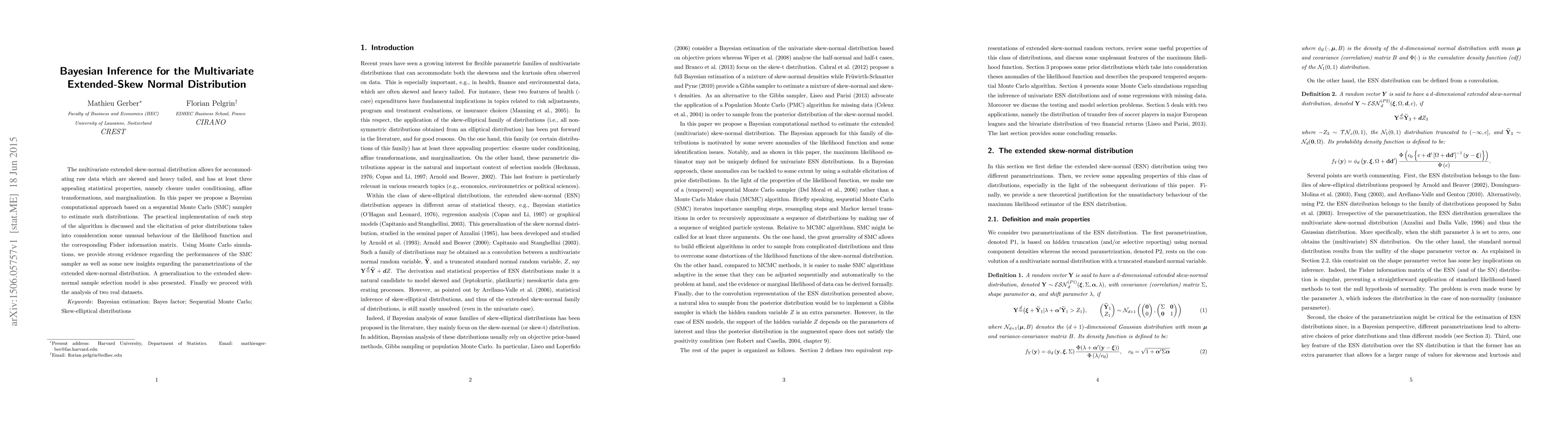 The paper proposes a Bayesian computational approach based on a Sequential Monte Carlo (SMC) sampler for estimating multivariate extended skew-normal distributions, addressing issues in standard maximum likelihood estimation and offering adaptability for a wide range of skew-elliptical distributions.