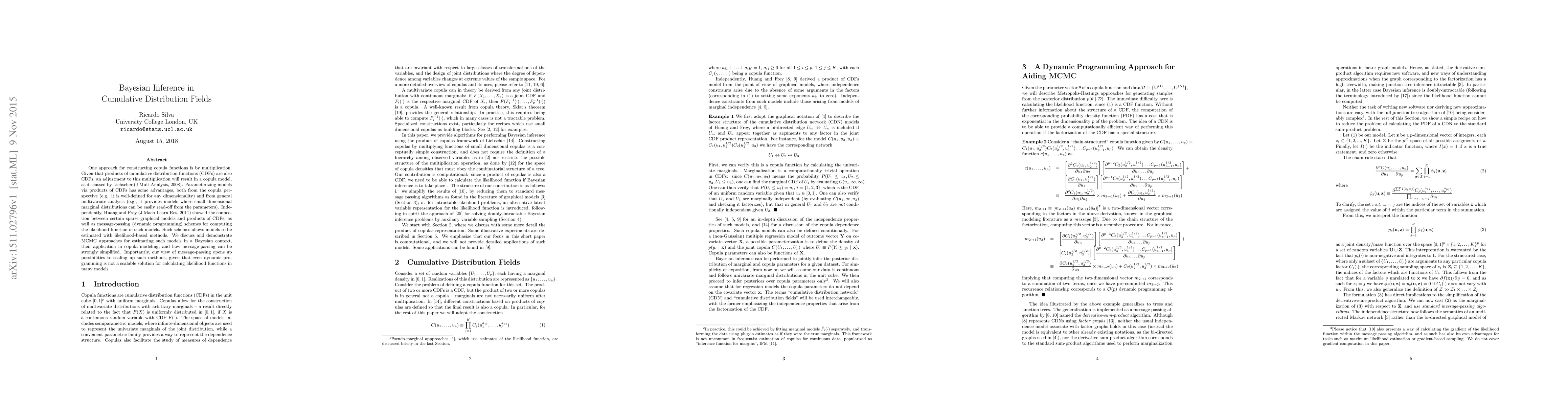 One approach for constructing copula functions is by multiplication. Given that products of cumulative distribution functions (CDFs) are also CDFs, an adjustment to this multiplication will result in a copula model, as discussed by Liebscher (J Mult Analysis, 2008). Parameterizing models via products of CDFs has some advantages, both from the copula perspective (e.g., it is well-defined for any dimensionality) and from general multivariate analysis (e.g., it provides models where small dimensional marginal distributions can be easily read-off from the parameters). Independently, Huang and Frey (J Mach Learn Res, 2011) showed the connection between certain sparse graphical models and products of CDFs, as well as message-passing (dynamic programming) schemes for computing the likelihood function of such models. Such schemes allows models to be estimated with likelihood-based methods. We discuss and demonstrate MCMC approaches for estimating such models in a Bayesian context, their application in copula modeling, and how message-passing can be strongly simplified. Importantly, our view of message-passing opens up possibilities to scaling up such methods, given that even dynamic programming is not a scalable solution for calculating likelihood functions in many models.