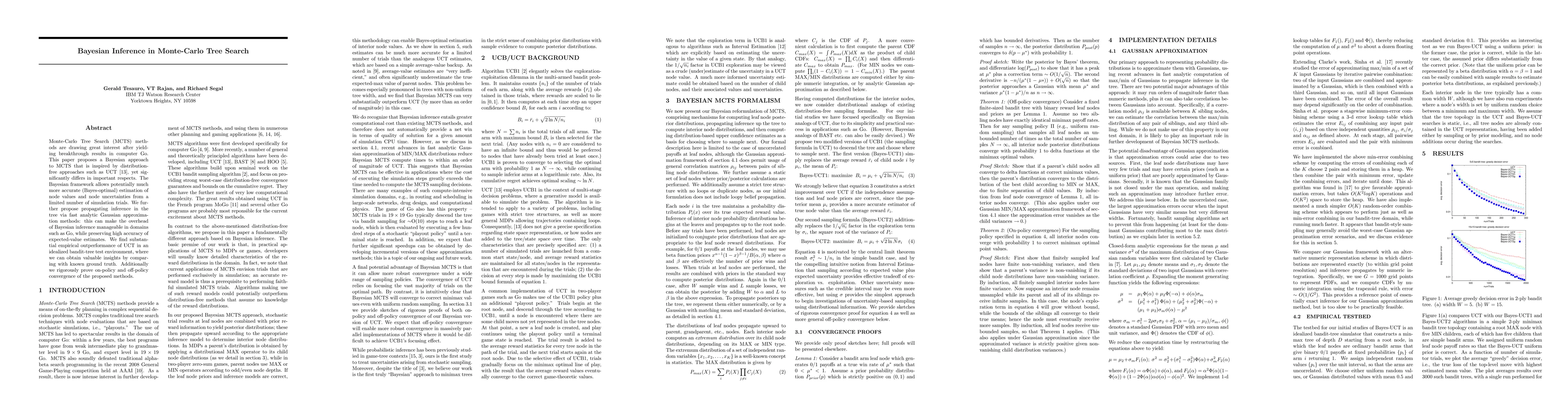 This paper introduces a Bayesian approach to Monte-Carlo Tree Search (MCTS), enhancing the accuracy of node value estimations and uncertainties through limited simulations. The proposed method leverages Gaussian approximations for efficient inference propagation, demonstrating significant performance improvements over the UCT algorithm in a test environment and proving convergence properties.
