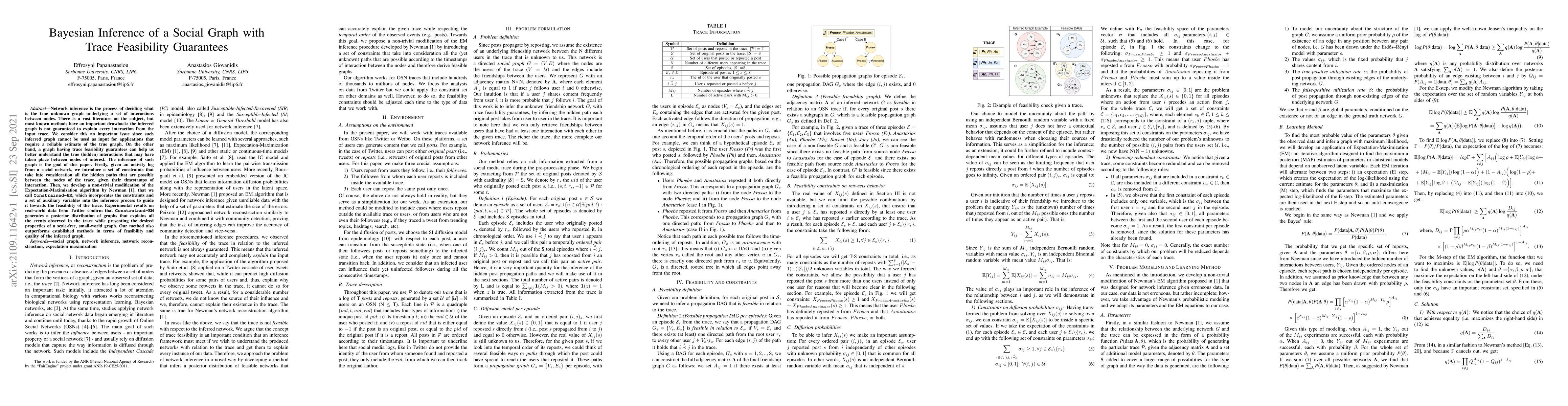 This paper proposes a Bayesian inference method called Constrained-EM to infer a social graph that guarantees to explain all interactions in a given trace. The method introduces constraints based on possible hidden paths and modifies the Expectation-Maximization algorithm to ensure trace feasibility, outperforming existing methods in both feasibility and graph quality, as demonstrated on Twitter data.