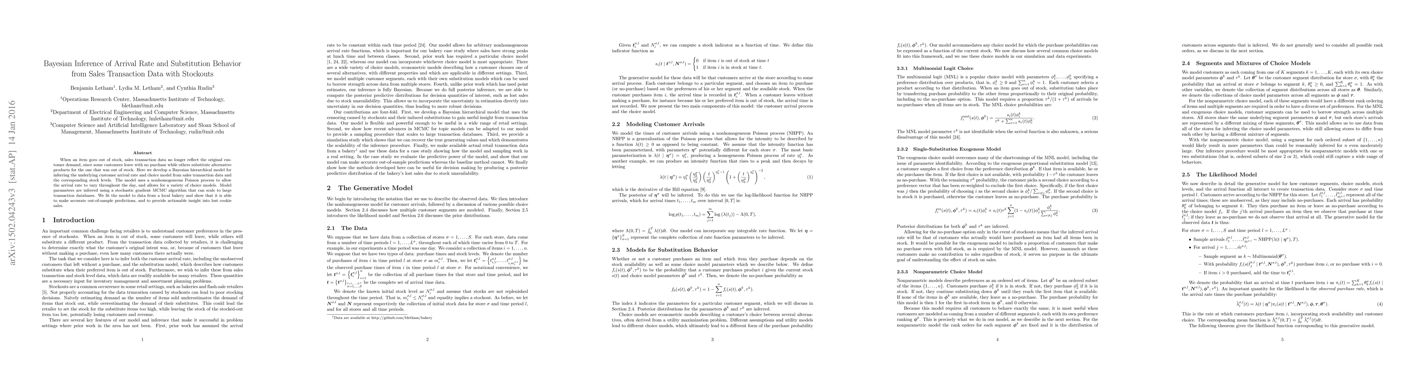 This paper develops a Bayesian hierarchical model to infer customer arrival rate and substitution behavior from sales transaction data, especially during stockouts. The model uses a nonhomogeneous Poisson process and fits to bakery data, demonstrating accurate predictions and insights into lost sales.