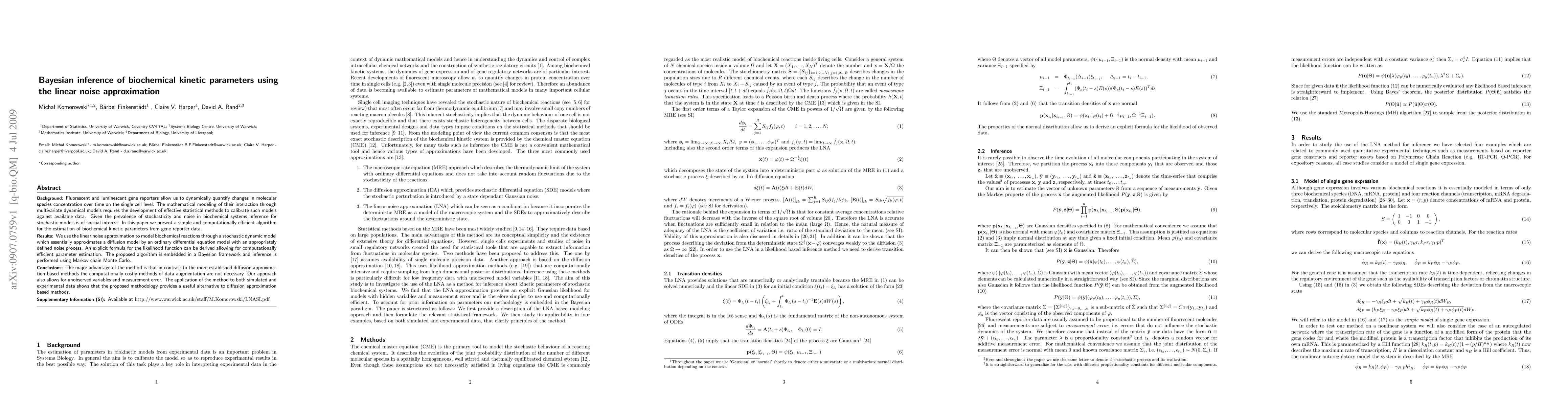 This paper proposes a Bayesian inference method for estimating biochemical kinetic parameters using the linear noise approximation, which simplifies stochastic dynamic models into ordinary differential equations with defined noise processes. The method, embedded in a Bayesian framework and utilizing Markov chain Monte Carlo, offers a computationally efficient alternative to diffusion approximation based methods, especially useful for handling unobserved variables and measurement errors.