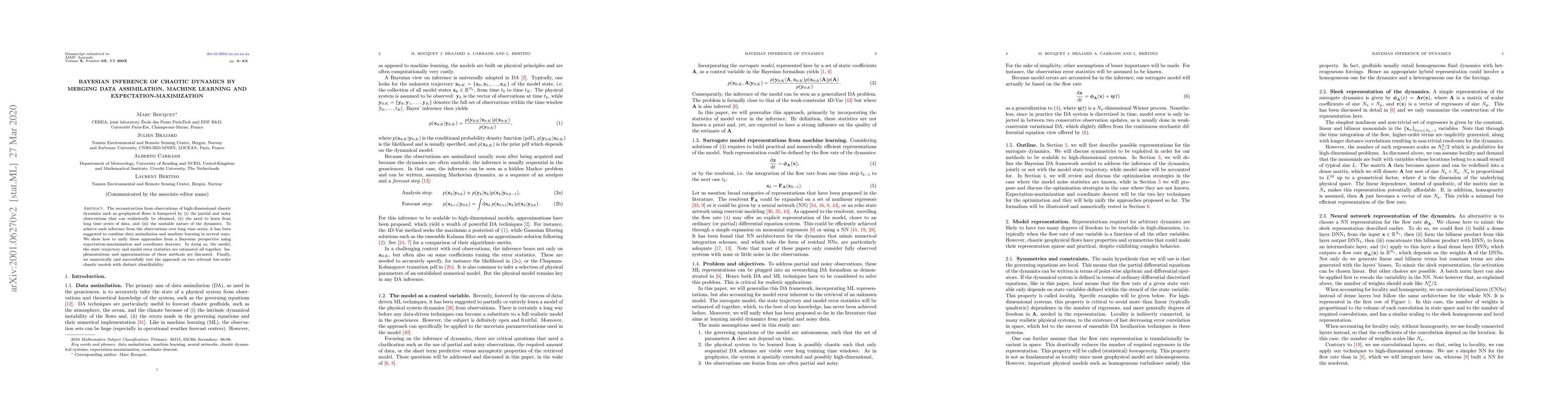 The reconstruction from observations of high-dimensional chaotic dynamics such as geophysical flows is hampered by (i) the partial and noisy observations that can realistically be obtained, (ii) the need to learn from long time series of data, and (iii) the unstable nature of the dynamics. To achieve such inference from the observations over long time series, it has been suggested to combine data assimilation and machine learning in several ways. We show how to unify these approaches from a Bayesian perspective using expectation-maximization and coordinate descents. In doing so, the model, the state trajectory and model error statistics are estimated all together. Implementations and approximations of these methods are discussed. Finally, we numerically and successfully test the approach on two relevant low-order chaotic models with distinct identifiability.