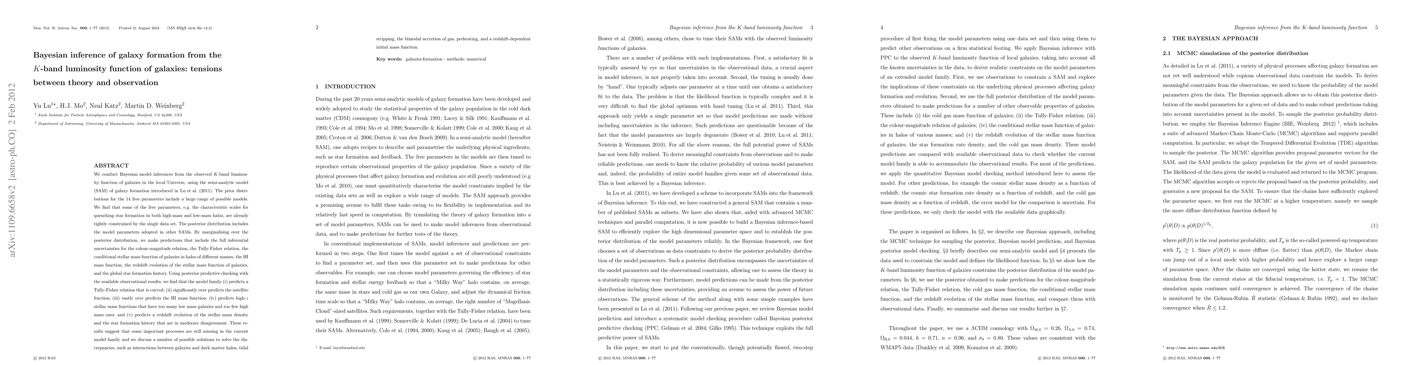 We conduct Bayesian model inferences from the observed K-band luminosity function of galaxies in the local Universe, using the semi-analytic model (SAM) of galaxy formation introduced in Lu et al (2011). The prior distributions for the 14 free parameters include a large range of possible models. We find that some of the free parameters, e.g. the characteristic scales for quenching star formation in both high-mass and low-mass halos, are already tightly constrained by the single data set. The posterior distribution includes the model parameters adopted in other SAMs. By marginalising over the posterior distribution, we make predictions that include the full inferential uncertainties for the colour-magnitude relation, the Tully-Fisher relation, the conditional stellar mass function of galaxies in halos of different masses, the HI mass function, the redshift evolution of the stellar mass function of galaxies, and the global star formation history. Using posterior predictive checking with the available observational results, we find that the model family (i) predicts a Tully-Fisher relation that is curved; (ii) significantly over predicts the satellite fraction; (iii) vastly over predicts the HI mass function; (iv) predicts high-z stellar mass functions that have too many low mass galaxies and too few high mass ones. and (v) predicts a redshift evolution of the stellar mass density and the star formation history that are in moderate disagreement. These results suggest that some important processes are still missing in the current model family and we discuss a number of possible solutions to solve the discrepancies, such as interactions between galaxies and dark matter halos, tidal stripping, the bimodal accretion of gas, preheating, and a redshift-dependent initial mass function.
